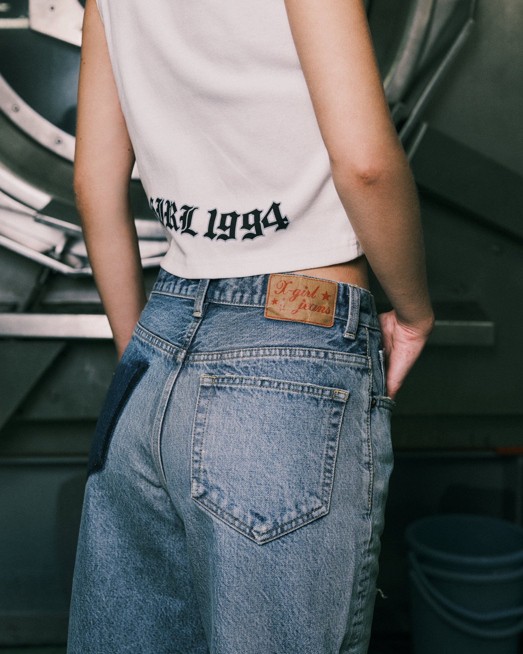 腰位置でラフに穿けるローライズデザインが、X-girlらしいストリートスタイルを演出。