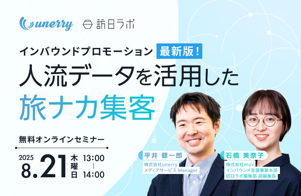 本セミナーでは、株式会社unerryと株式会社movが共催し、「インバウンドの旅ナカ行動」に焦点を当て、訪日外国人が“日本のどこを回遊し、どのように消費しているのか”を解説いたします。
