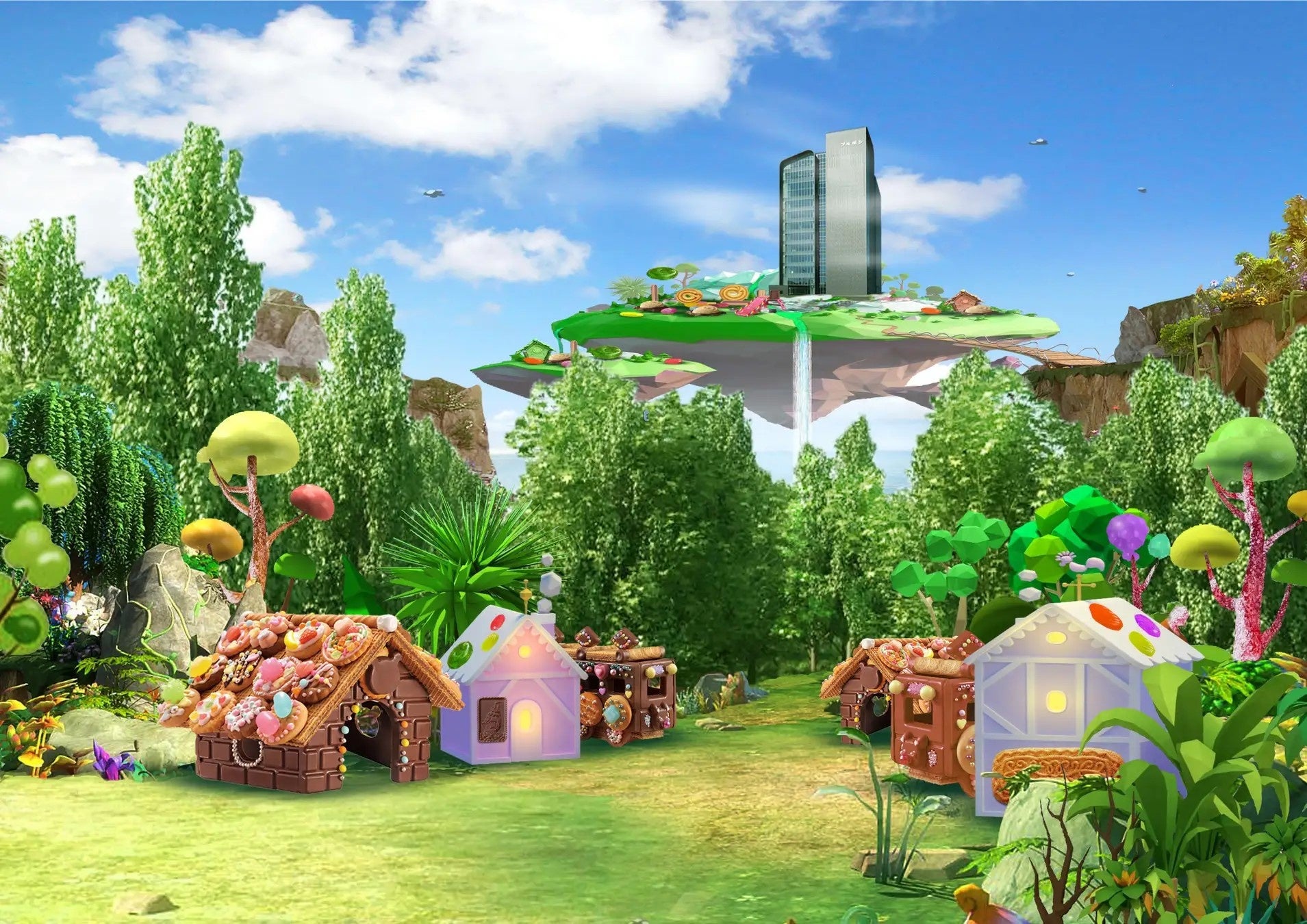 “メタバース技術を活用することで、物理的な距離感を超えて人と人とが身近に新たな方法でつながり、新しいコミュニティへの参加を可能とします。これにより当社は、お客様との様々なコミュニケーションの可能性を探求し、新たな価値の創造と提供につなげる取り組みを目指します。「ブルボンメタバース」は、「お菓子の森エリア」と「ブルボン本社ビルエリア」、「イベントエリア」の 3 つにより構成しています。「お菓子の森エリア」では、お菓子のおうちやお菓子のでんしゃ、クイズなどファンタジーな世界を体験いただけます。 “