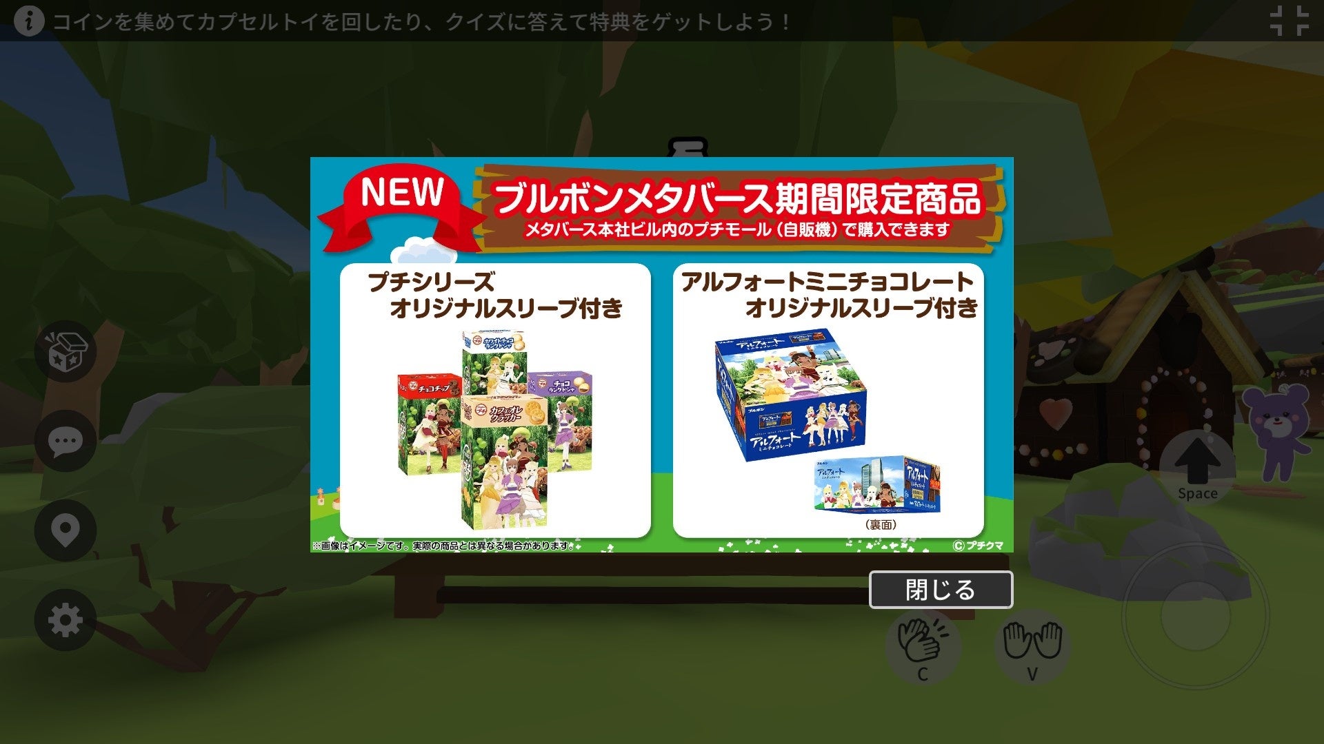 このメタバース内で利用者同士がテキストチャットで会話できるほか、「ブルボンオンラインショップ」にリンクして、学生が製作したキャラクターが掲載されたコラボ商品を購入することもできます。