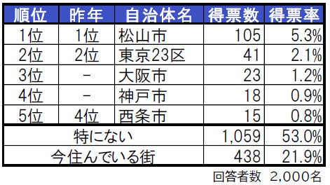 住みたい街1位は5年連続で松山市。2位は2年連続で東京23区。3位大阪市。