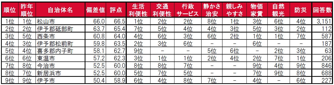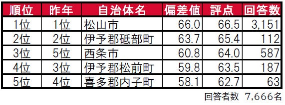 住みここち1位は4年連続で松山市。2位は2年連続で伊予郡砥部町。3位西条市。