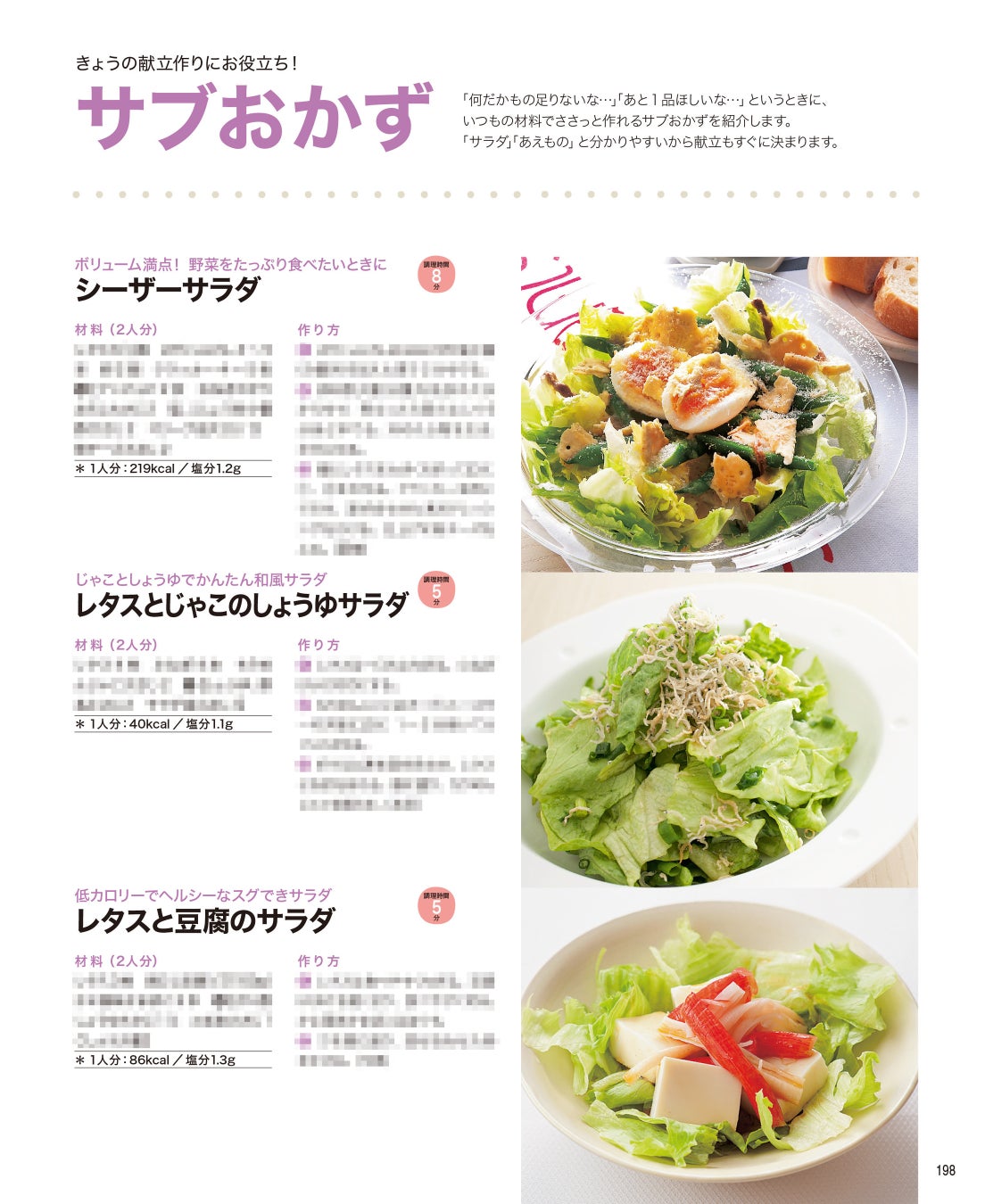 毎日の献立作りに役立つ定番食材で手軽に作れる、サブおかず・汁もの&スープ、さらに一皿で満足でき、時間のないときにもぴったりなごはん・めん類のレシピも充実。