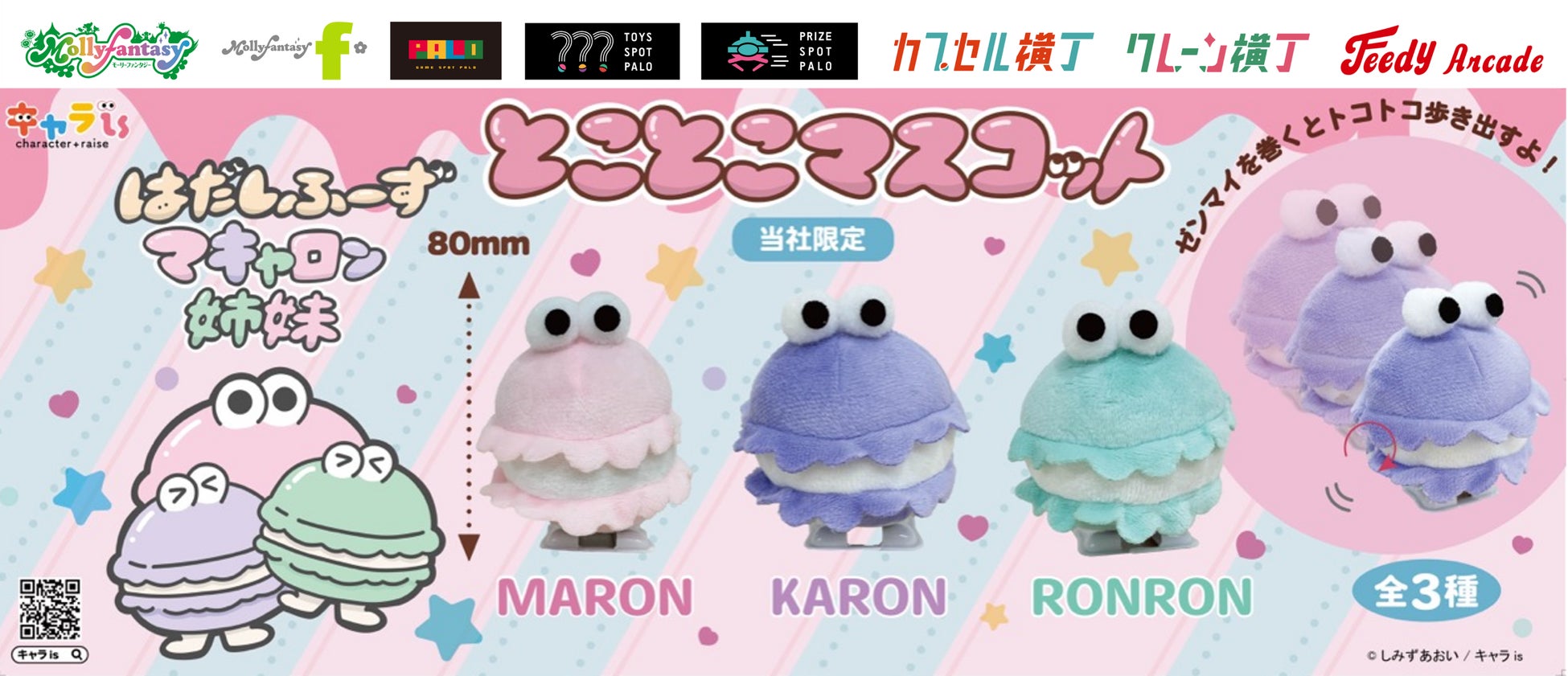 株式会社イオンファンタジー(本社:千葉県千葉市、代表取締役社長:藤原徳也、以下、当社)は、当社が運営するオリジナルキャラクター特化型プラットフォーム「キャラ is」(URL: https://charaise.jp/)から生まれたキャラクター「はだしふーず マキャロン姉妹」のカプセルトイ用商品「はだしふーず マキャロン姉妹 とことこマスコット」を、アミューズメント施設「モーリーファンタジー」「PALO」、カプセルトイ専門店「TOYS SPOT PALO」「カプセル横丁」などに設置する当社オリジナル完全キャッシュレスカプセルトイマシン「かぷえぼ」にて5月23日(金)より順次展開いたします。