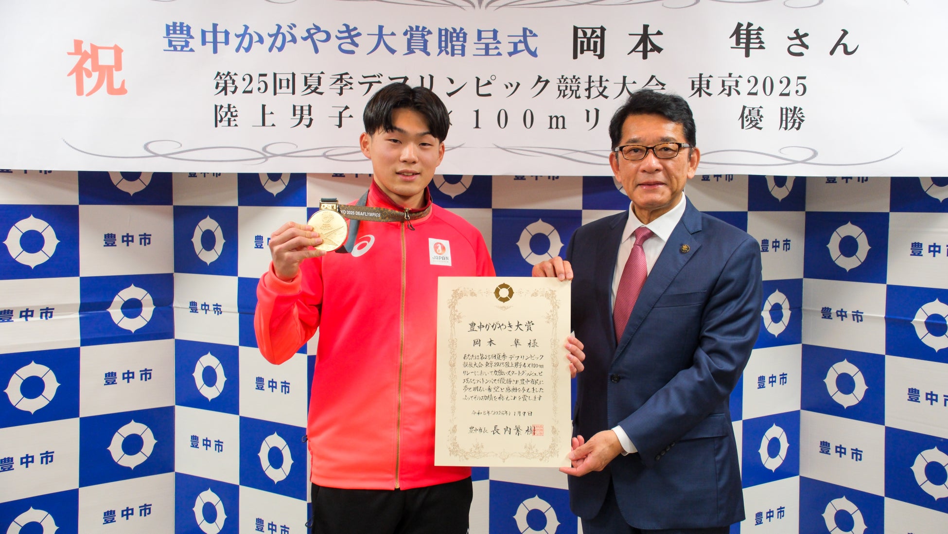令和7年11月15日~11月26日に開催された「第25回夏季デフリンピック競技大会 東京2025」において、本市出身の岡本隼さんが陸上男子4×100mリレーに日本代表として出場し、金メダルを獲得されました。 この快挙を賞して、長内繁樹豊中市長から「豊中かがやき大賞」(※)を贈りました。