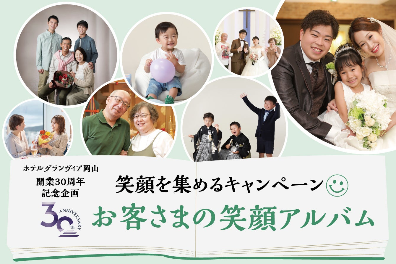 ホテルグランヴィア岡山(岡山市北区駅元町1-5、代表取締役社長:卜部 基宏)は、開業30周年を記念し、笑顔を集めるキャンペーン『お客さまの笑顔アルバム』を開催しています。第3章となる今回は、「笑顔」×「岡山」をテーマに、岡山で撮影されたお客さまの笑顔の写真とエピソードを募集いたします。