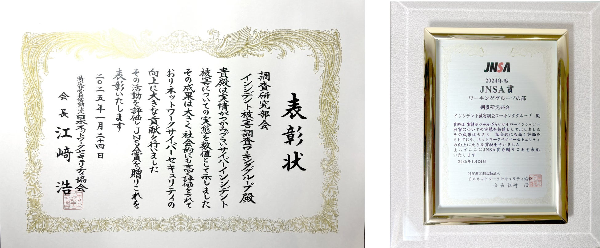 特定非営利活動法人 日本ネットワークセキュリティ協会(JNSA)が主催する「2024年度JNSA表彰」において、キヤノンマーケティングジャパングループのキヤノンITソリューションズ株式会社(本社:東京都港区、代表取締役社長:金澤 明、以下キヤノンITS)社員2名がサブリーダー/メンバーとして参画している「インシデント被害調査ワーキンググループ」が「JNSA賞」を受賞しました。