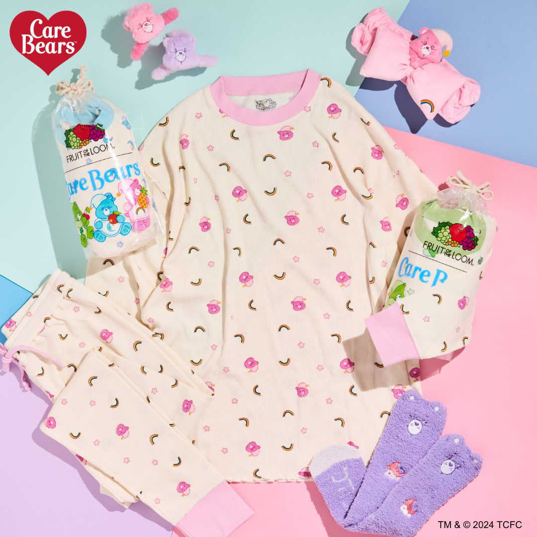ケアベアたちと一緒にパジャマを着て、おうちでののんびりタイムや、お友達とのお泊まり会を楽しんでくださいね。
