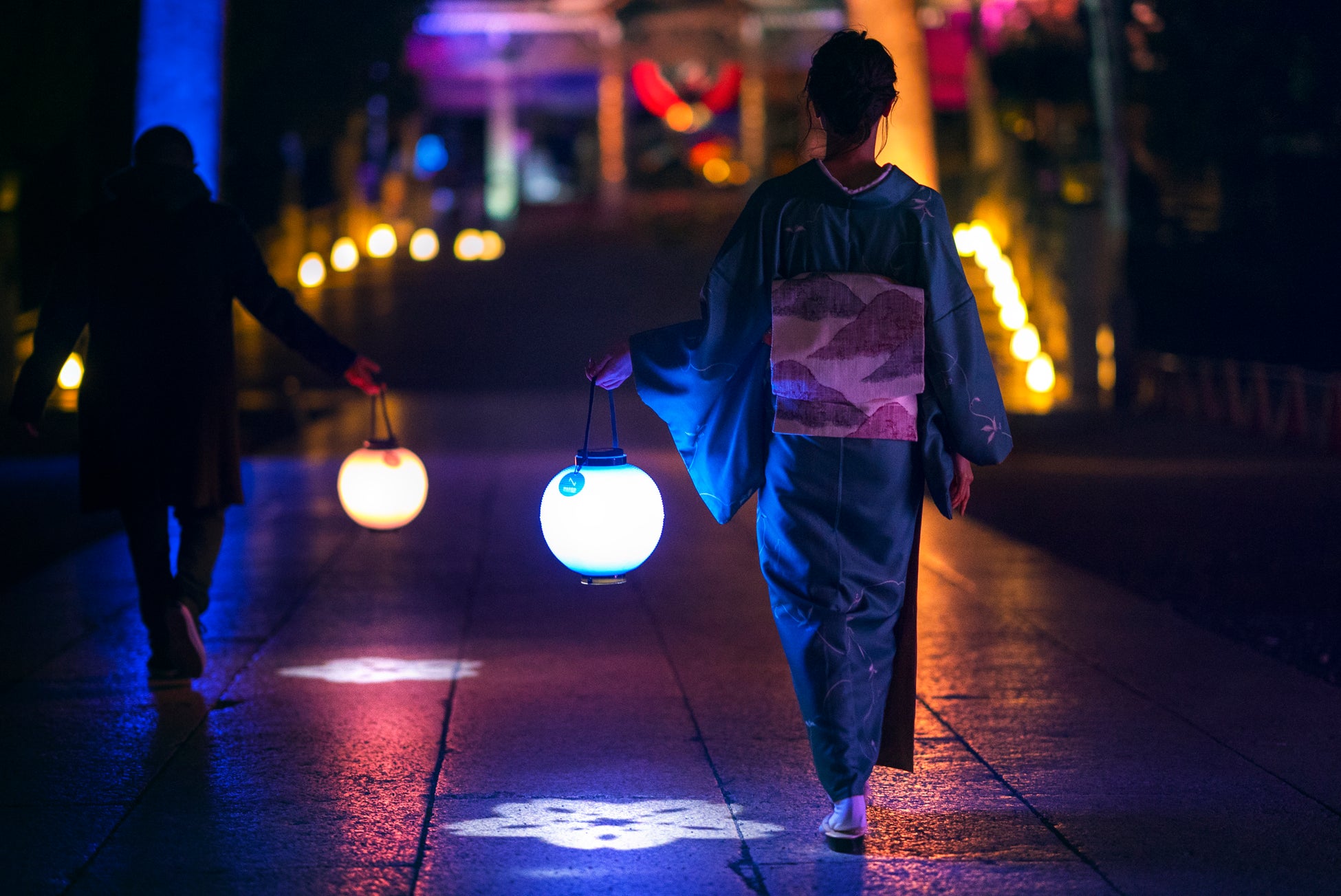 コロナ禍に誕生したNAKED発案のアートな提灯。地面に映し出される提灯の光の輪で、まるで光の一部になったように感じられる参加型アートに。提灯の光は、斑鳩町・法隆寺に縁のある椿や山茶花、柿の柄で、地域の魅力も再発見できます。