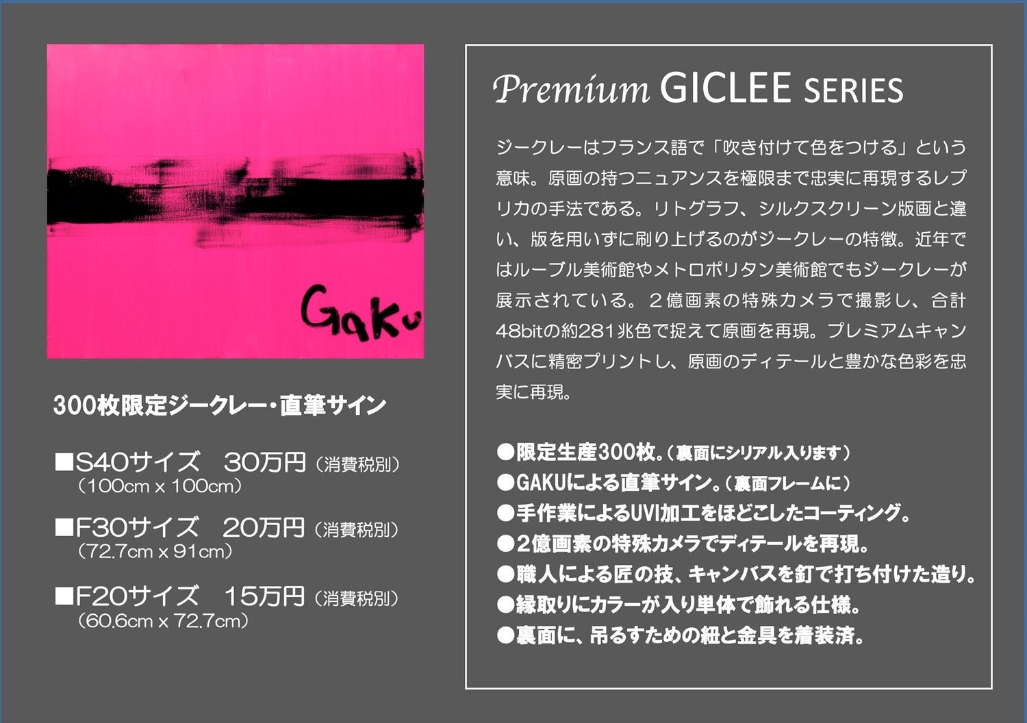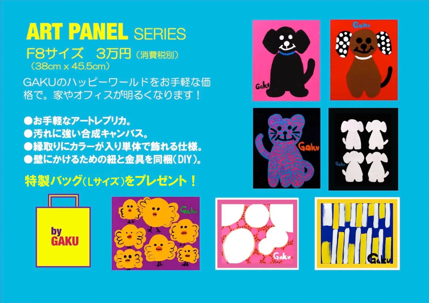 今回は、原画を忠実に再現したジークレーやキャンバス印刷のアートパネルの他にもバッジやトートバックなどGAKUのポップで独創的なアイテムをご用意しました。ぜひご覧ください。