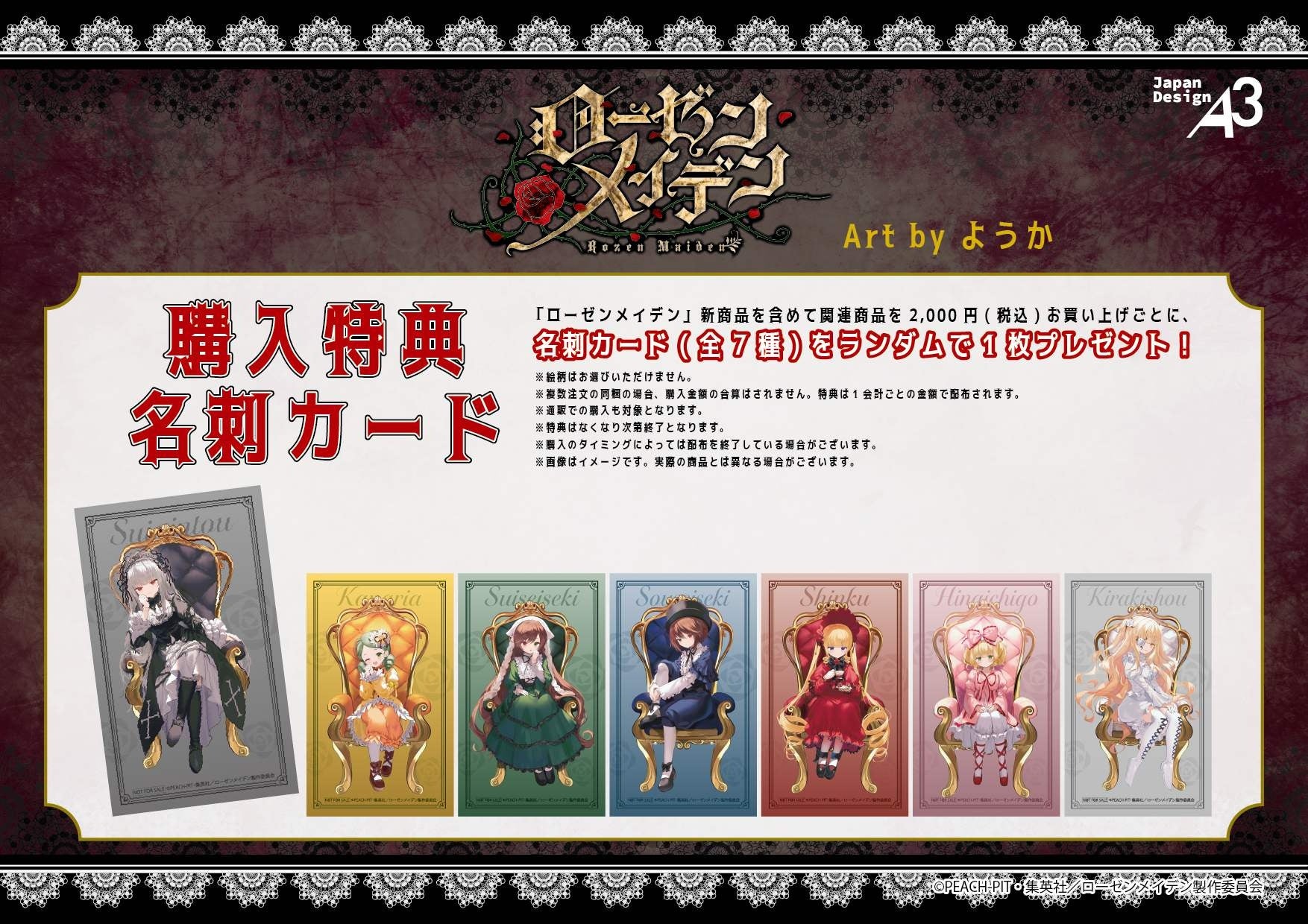 TVアニメ『ローゼンメイデン』の新作グッズを含む関連商品を1会計で2,200円(税込)お買い上げごとに、名刺カード(全7種)をランダムで1枚プレゼントします。