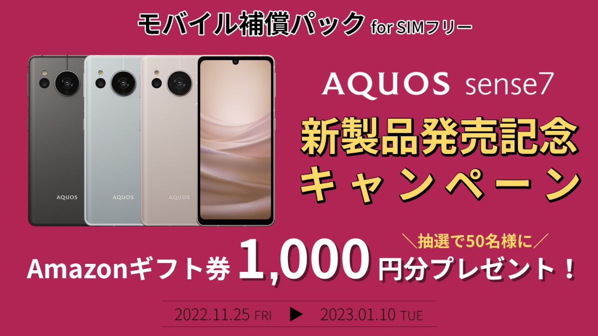 本キャンペーンでは、対象期間中(2022年11月25日(金)~2023年1月10日(火))に、SIMフリースマートフォン「AQUOS sense7」<SH-M24>をご購入の上、「モバイル補償パックS」を新規ご契約いただいたお客様の中から、抽選で50名様に1,000円分のAmazonギフト券をプレゼントします。