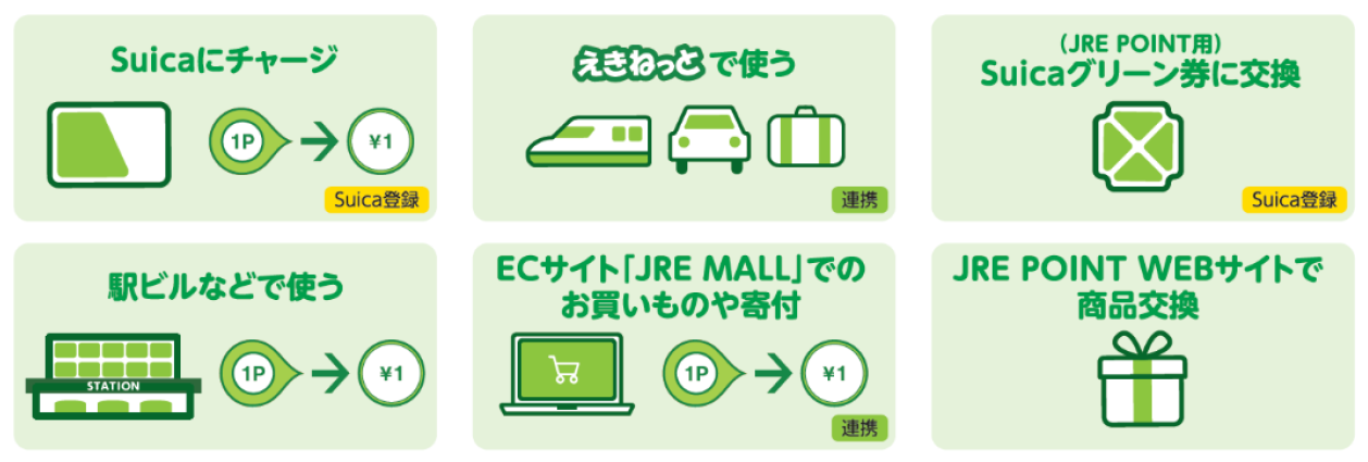 JRE POINTならではの鉄道でのご利用や、駅ビルなどのお買いもので1ポイント1円相当としてお買いものでお支払い時にポイントを使うことができます。