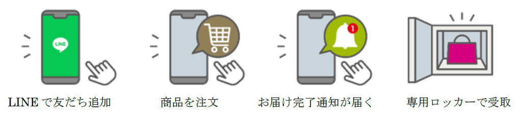 専用ECモールから、受取駅(ロッカー)・受取日・商品を選びクレジットカードで決済をすると、注文が完了します。注文後、お届けが完了するとLINEでお届け完了通知が届きますので、通知内のロッカー解錠用二次元コードを準備の上、専用ロッカーで商品をお受け取りいただきます。