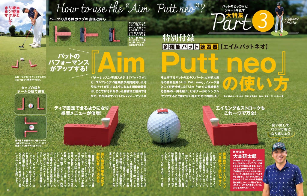 特別付録として、昨年に付けて大好評を博した多機能パット練習器を進化させたAimPutt neoを全読者に提供、その使い方もパット特集のパート3に掲載!