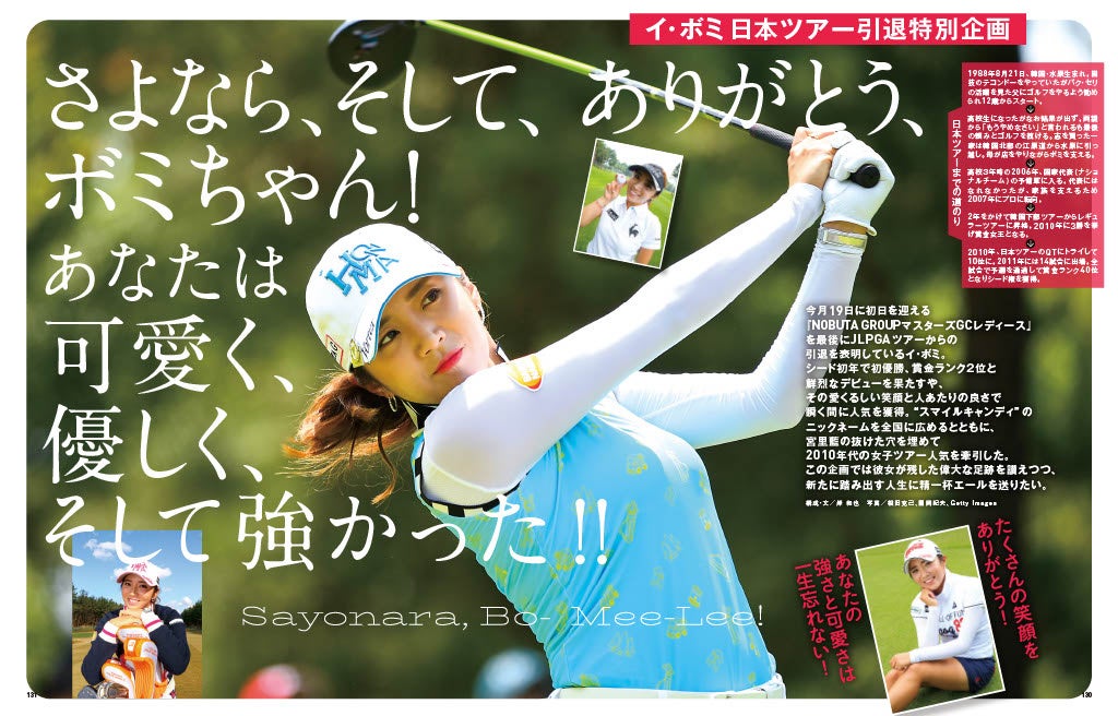 2010年代の女子ツアーを牽引したイ・ボミが10月に日本ツアー引退を表明。その足跡をエピソードや写真を追う特別企画。専属キャディとして契約してた清水重憲の彼しか知らない裏話も満載。