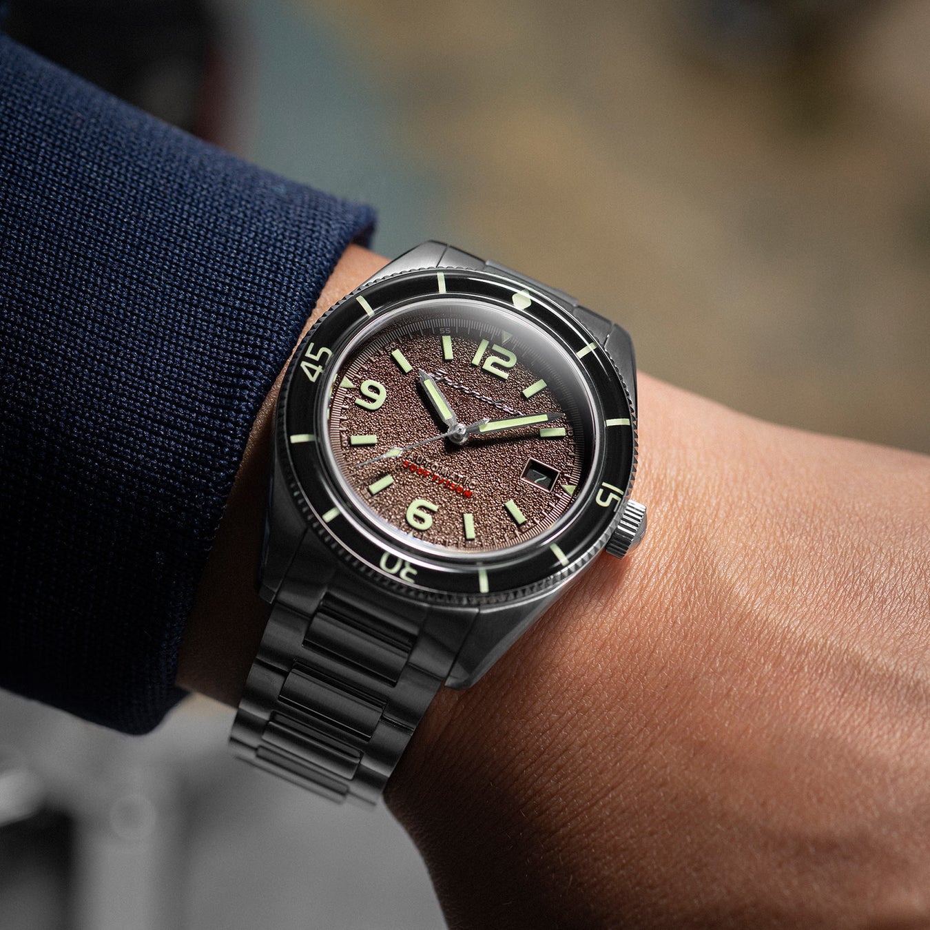 ヴィンテージ加工を施し、細かな凹凸で覆われたブラウンのダイヤルに、シャープな印象を与えるステンレススチールブレスレットを合わせた、公式オンラインストア限定モデル。2022年3月18日(金)に発売します。