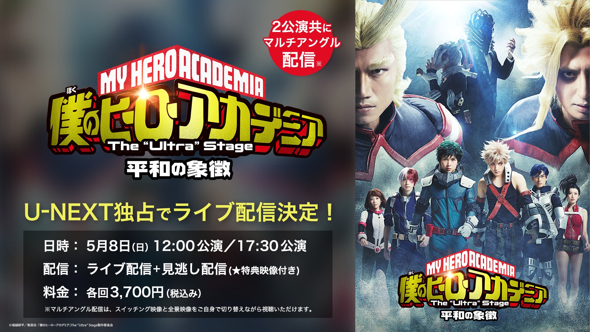 USEN-NEXT GROUPの株式会社U-NEXT(本社:東京都品川区、代表取締役社長:堤 天心)が運営する動画配信サービス「U-NEXT」は、「僕のヒーローアカデミア」The “Ultra” Stage 平和の象徴 の東京公演 2022年5月8日(日)12:00/17:30 公演を独占でライブ配信することを決定いたしました。当日はマルチアングル配信(※1)となっており、メインとなるスイッチング映像と全景映像をご自身で切り替えながらご覧いただけます。また配信購入特典として、各公演終了後に特典映像(回替わりキャストコメント映像)を配信予定です。