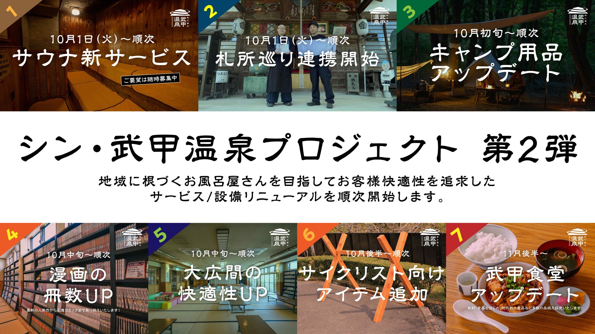 株式会社温泉道場(埼玉県比企郡ときがわ町、代表取締役 山崎寿樹)が運営する秩父湯元 武甲温泉(埼玉県横瀬町、以下、武甲温泉)は、2024年10月1日(火)より順次、無料アイテムの追加及び新サービスの提供を開始いたします。