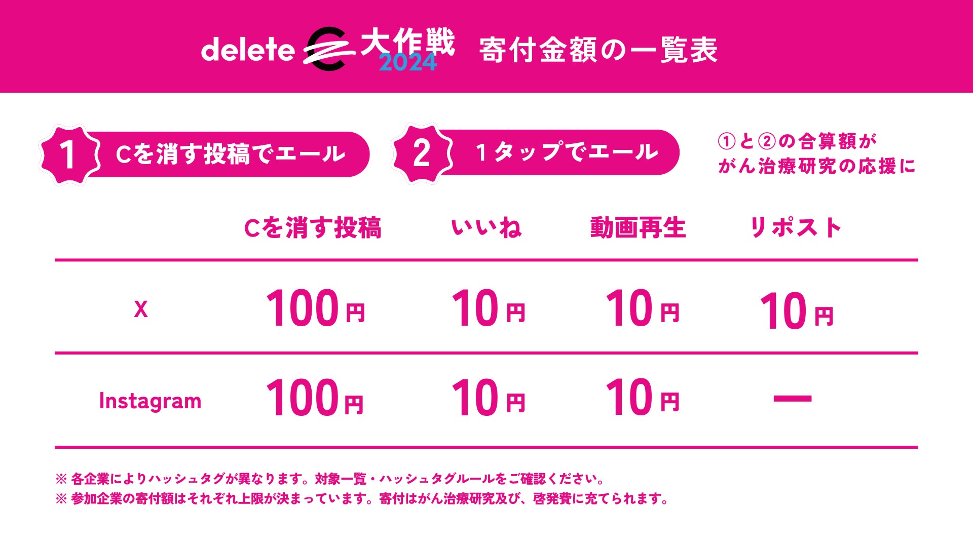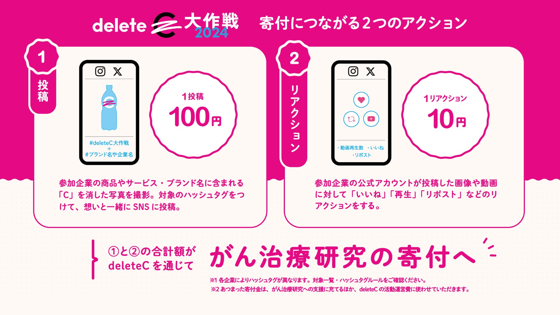 寄付 1投稿あたり100円が、1リポスト/いいね(※1)/1再生/あたり10円が、がん治療研究への寄付・啓発費用として、当社からdeleteCに贈られます(※2)。
