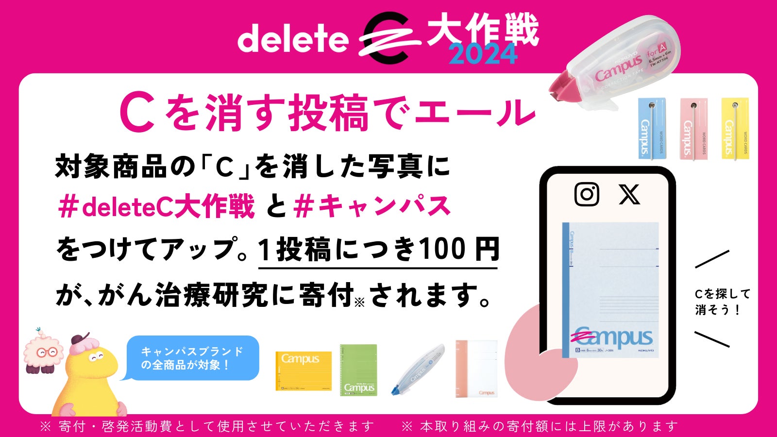 今回の「#deleteC大作戦」では、対象をキャンパスノートだけでなく、キャンパスブランド全商品に拡大して実施します。期間中に、キャンパスブランド商品の「Campus」ロゴの「C」の部分を自由なカタチで消した画像や動画を、「#deleteC大作戦」と「#キャンパス」をつけてSNSで投稿、もしくは「コクヨのぶんぐ」の公式X(@kokuyo_st)の該当投稿に対してリアクション(リポストやいいね)・再生をすると、1投稿あたり100円が、1リアクション・再生あたり10円が、がん治療研究への寄付・啓発費用として、当社からdeleteCを通じて届けられます。