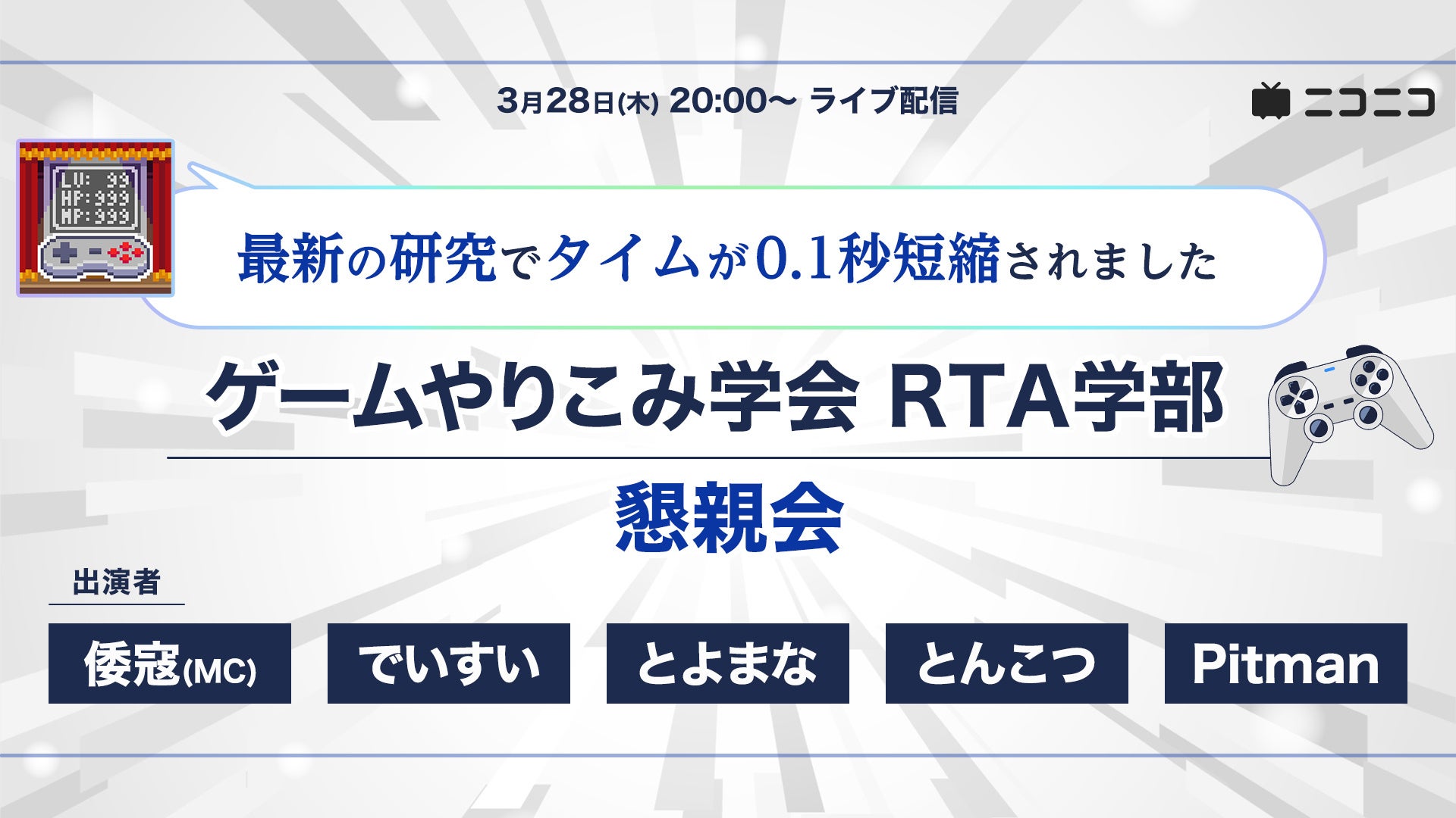 株式会社ドワンゴは運営する動画コミュニティサービス・ニコニコで、2024年3月28日(木)に「ゲームやりこみ学会 RTA学部 懇親会」と題し、ゲーム実況者によるトーク番組を実施します。