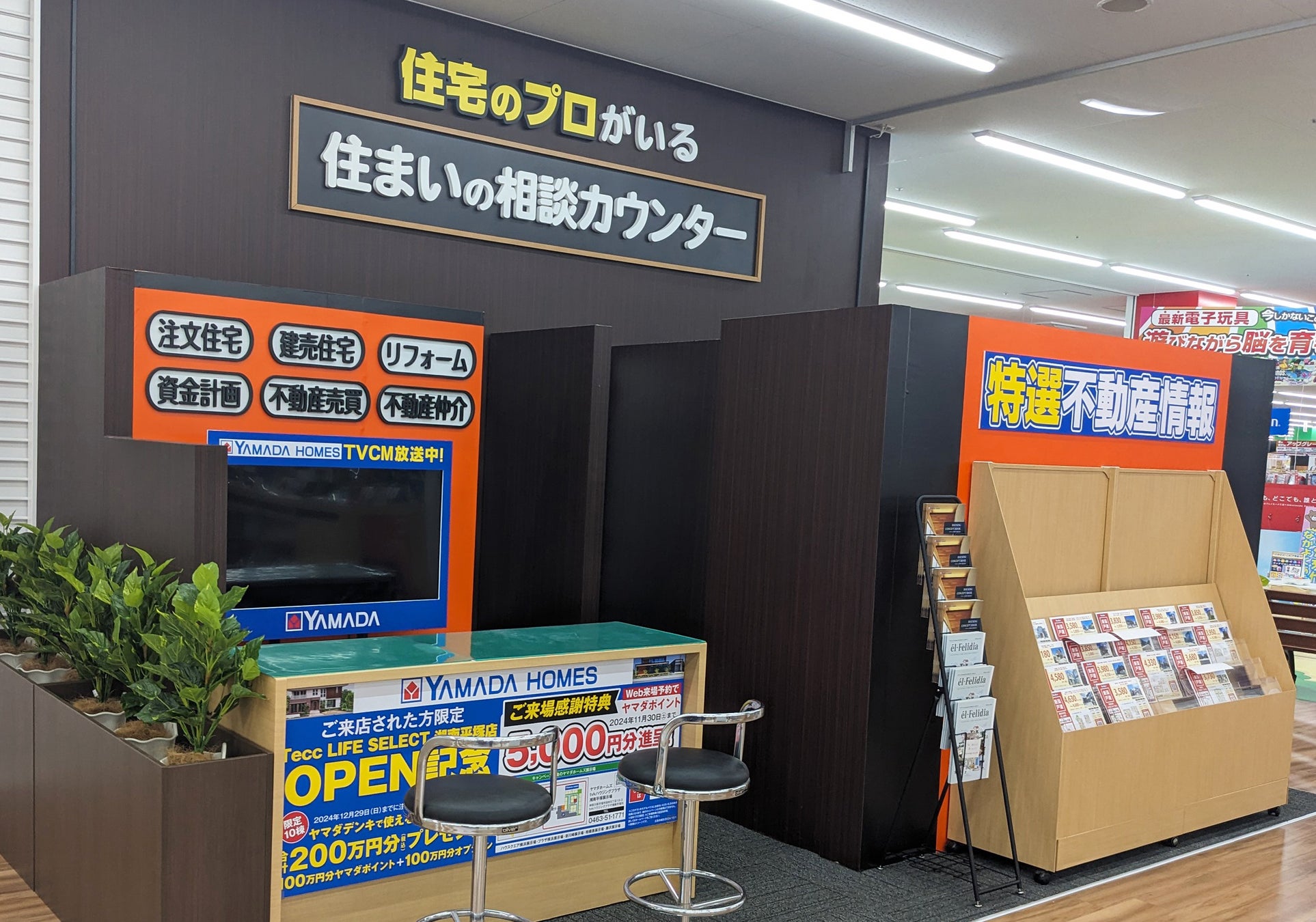 店内に設置された「住まいの相談カウンター」では、宅地建物取引士の有資格者が在籍し、注文住宅や建売住宅、リフォームから不動産買取まで、住まいに関するご相談を承ります。