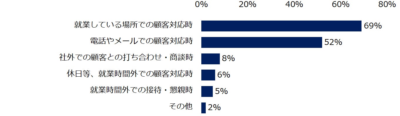 職場で被害を見たことや、聞いたことが「ある」と回答した方に、カスハラ被害を受けたとされる、場所・シチュエーションを伺うと、トップは「就業している場所での顧客対応時」(69%)、次いで「電話やメールでの顧客対応時」(52%)という結果でした。