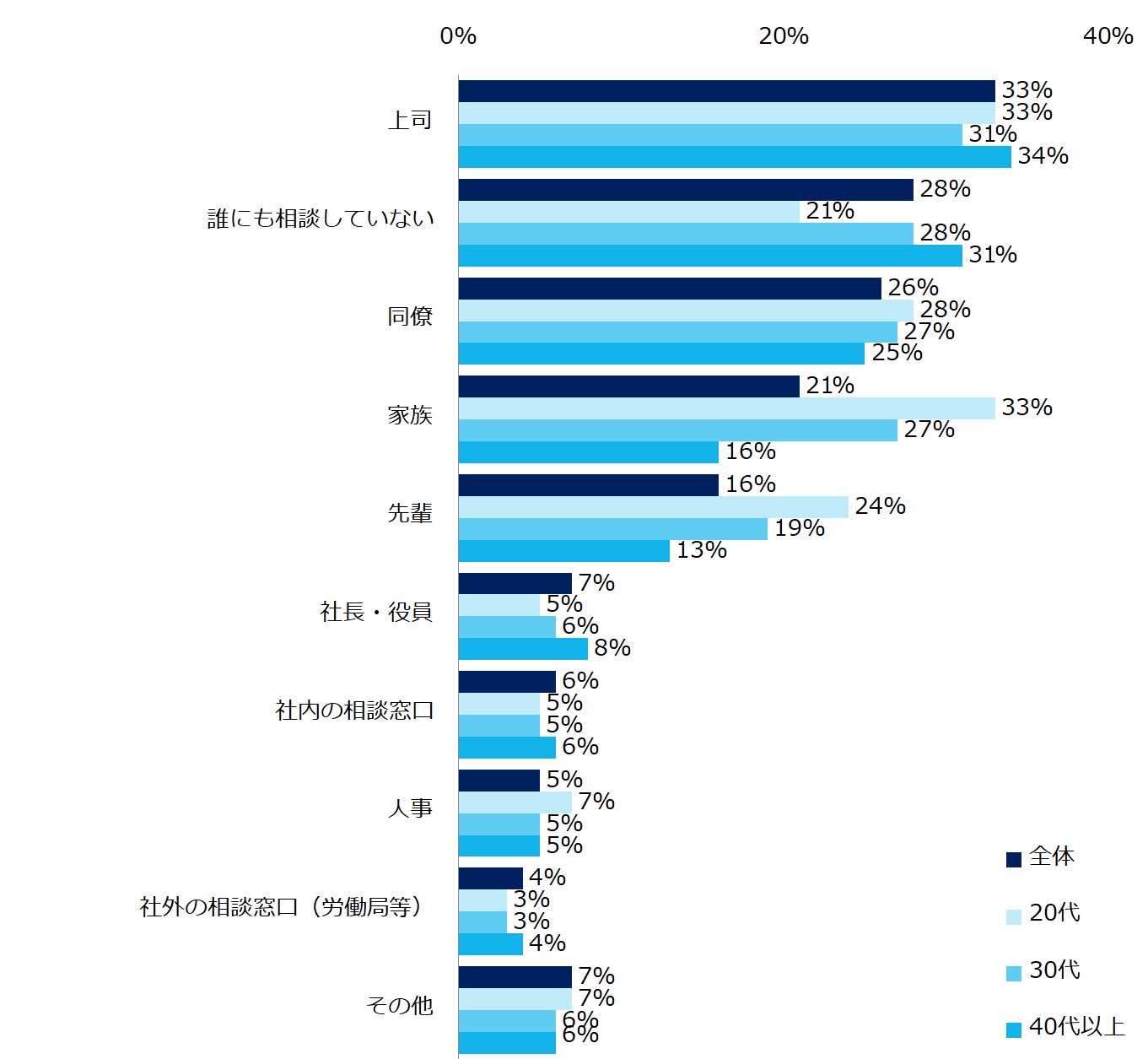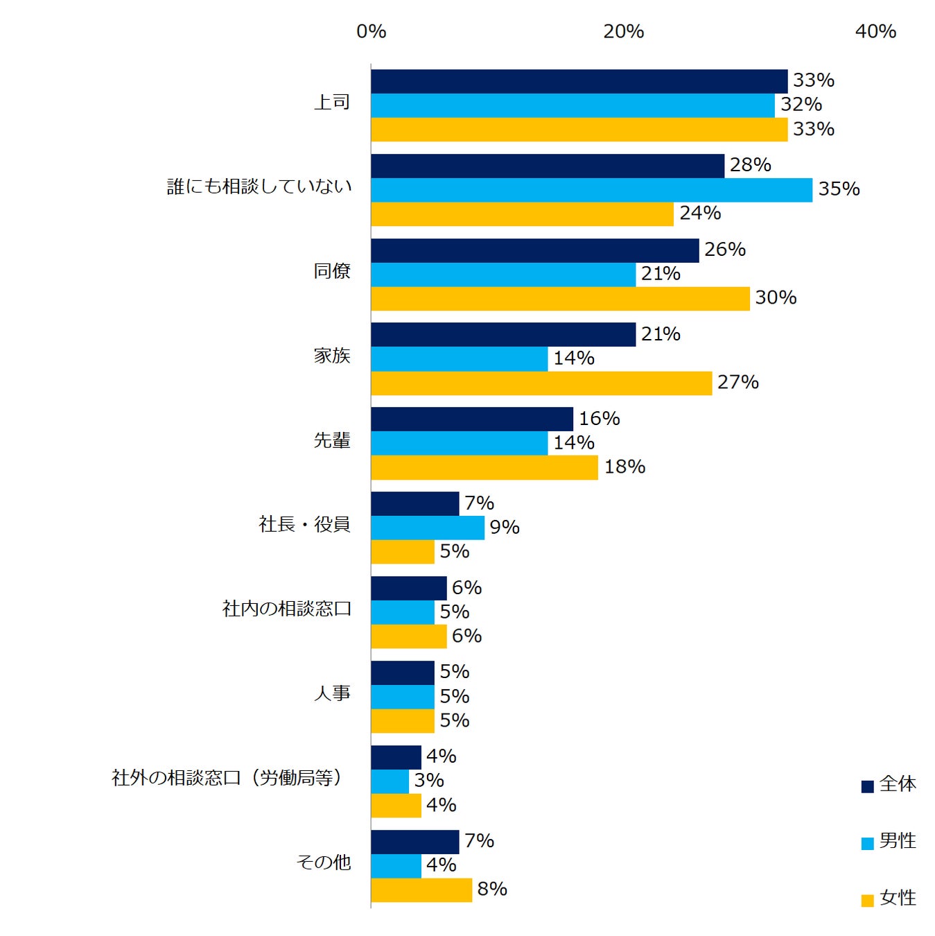 職場でハラスメントを受けたことがある方に「誰かに相談しましたか?」と伺うと、トップ3は「上司」(33%)、「誰にも相談していない」(28%)、「同僚」(26%)でした。年代別では、「誰にも相談していない」で10ポイントの差(20代:21%、40代以上:31%)、「家族」で17ポイントの差(20代:33%、40代以上:16%)、「先輩」で11ポイントの差(20代:24%、40代以上:13%)がありました。男女別で見ると、10ポイント以上差が開いたのは「家族」(男性:14%、女性:27%)、「誰にも相談していない」(男性:35%、女性24%)でした。