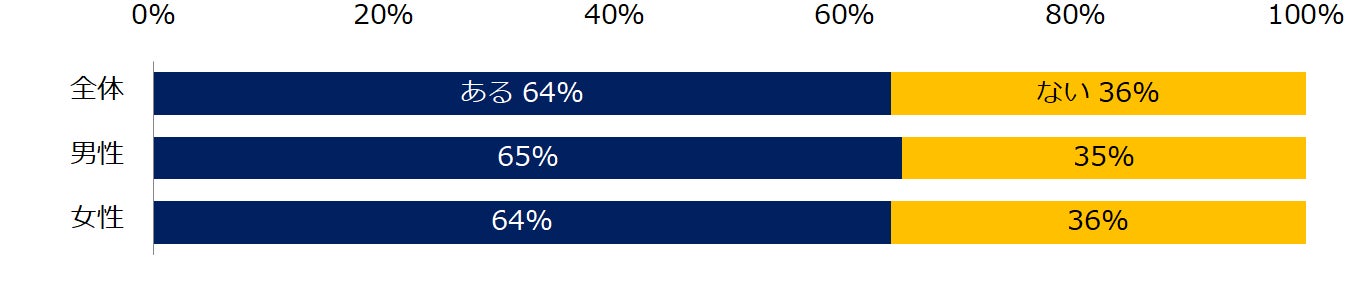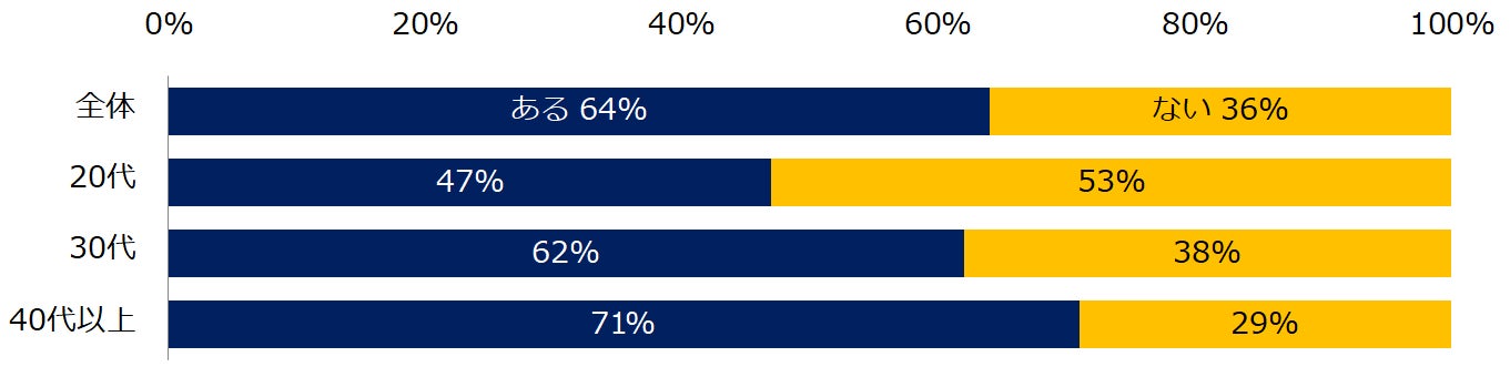 「これまで職場でハラスメントを受けたことがありますか?」と伺うと、64%が「ある」と回答しました。年代別でみると、40代以上が71%と20代の47%より24ポイント高く、年代が高い方ほど、ハラスメントを受けた経験があることが分かりました。男女での差は、ほとんどありませんでした(男性:65%、女性:64%)。