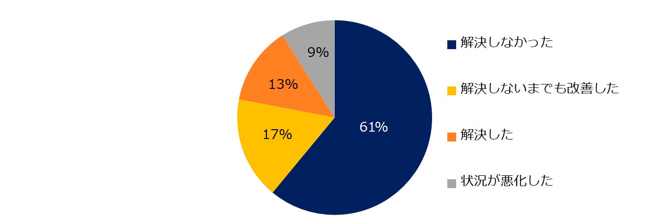 続いて、相談先を「上司、先輩、同僚、人事、社長・役員、社内の相談窓口、社外の相談窓口(労働局等)、家族」のいずれかと回答した方に、相談した結果について聞くと「解決した」方は13%でした。具体的なエピソードも紹介します。