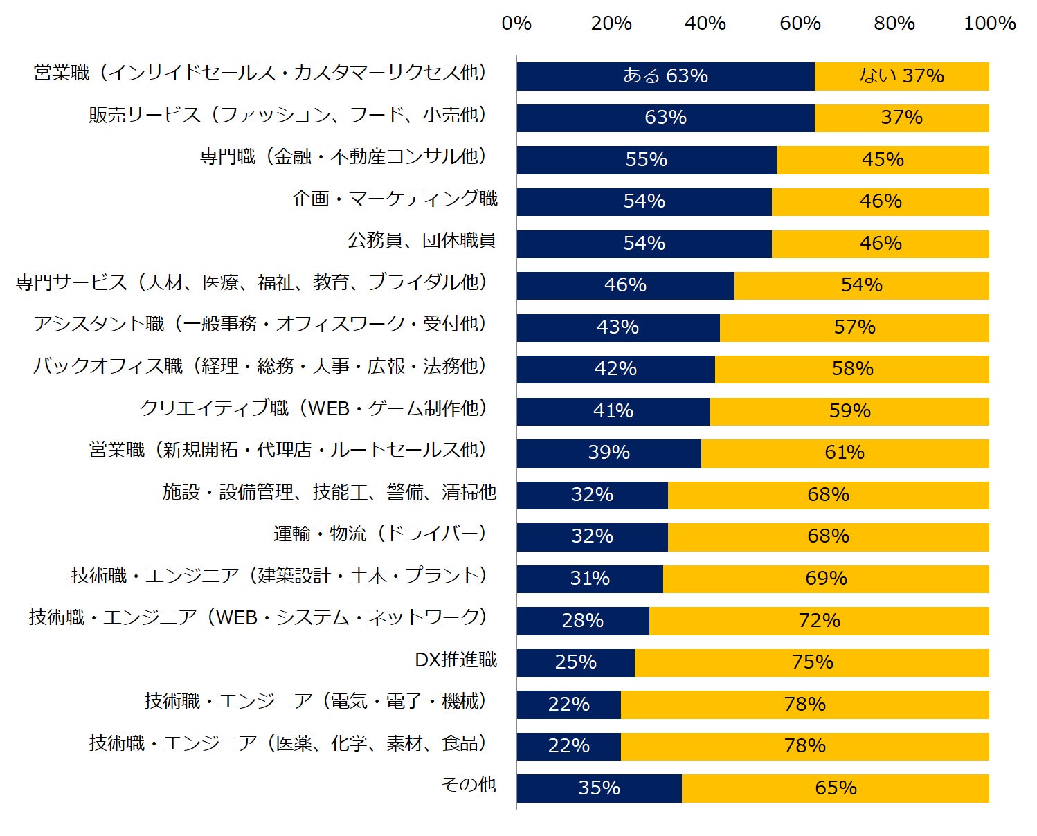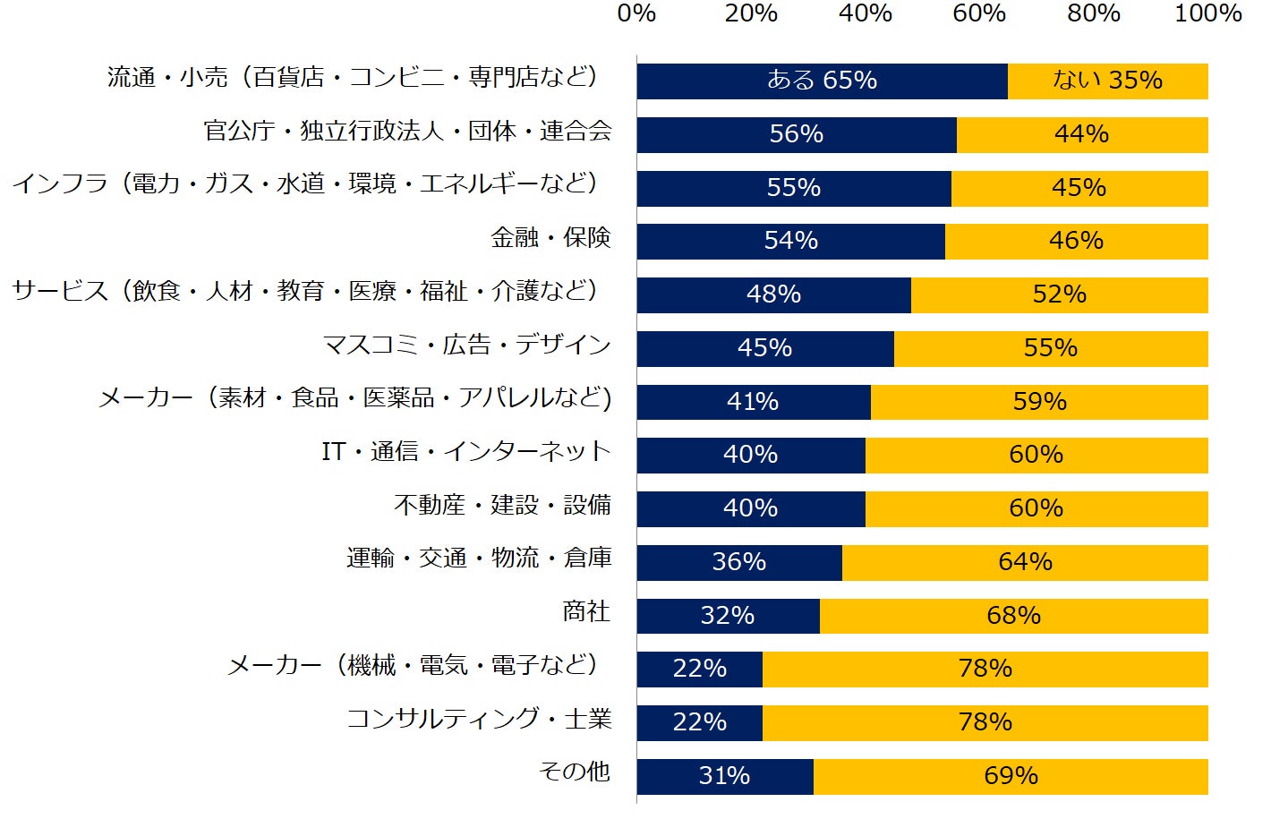 近年、増加している「カスハラ(顧客等からの著しい迷惑行為)」について、職場で被害を見たことや、聞いたことがあるか伺うと、45%が「ある」と回答しました。「ある」の回答が多かった職種トップは「営業職(インサイドセールス・カスタマーサクセス他)」「販売サービス(ファッション、フード、小売他)」(63%、同率1位)でした。業種別では、「流通・小売(百貨店・コンビニ・専門店など)」(65%)が最多でした。