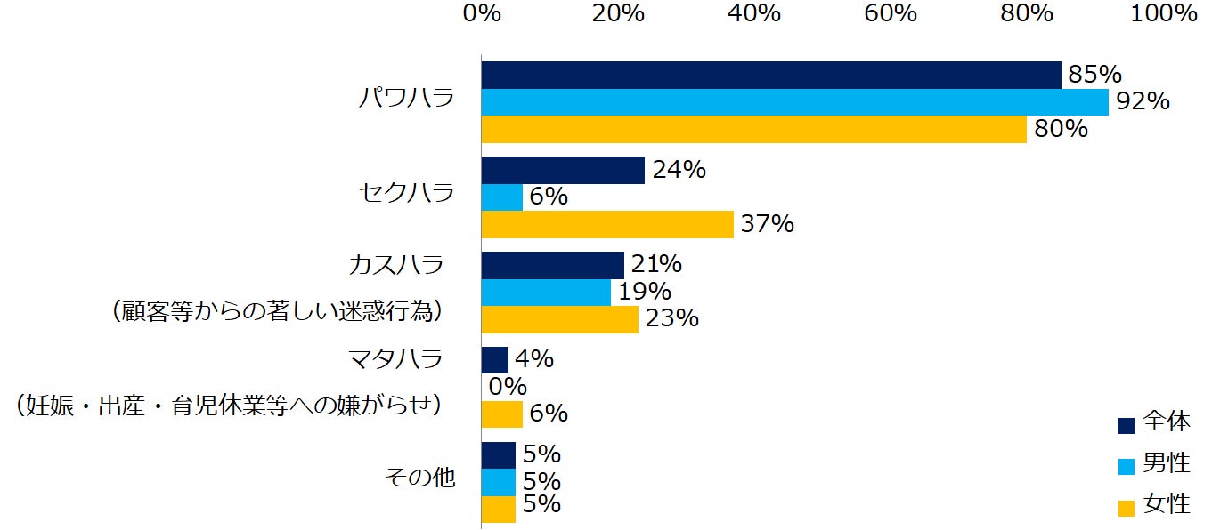 【図7】これまで職場でハラスメントを受けたことが「ある」と回答した方に伺います。どんなハラスメントを受けましたか?(複数回答可/男女別)