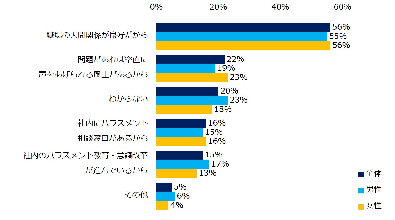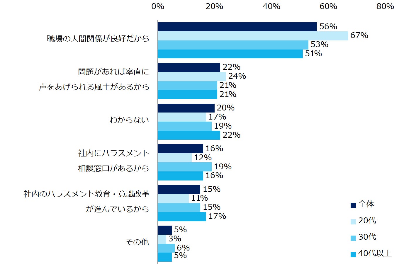 また、職場でハラスメントを受けたことが「ない」と回答した方に「ハラスメントを受けない理由は何だと思いますか?」と伺うと、最多は「職場の人間関係が良好だから」(56%)でした。年代別で見ると、20代(67%)が30代(53%)、40代(51%)より10ポイント以上高い結果となりました。男女別では、ほとんど差はありませんでした(男性:55%、女性56%)。