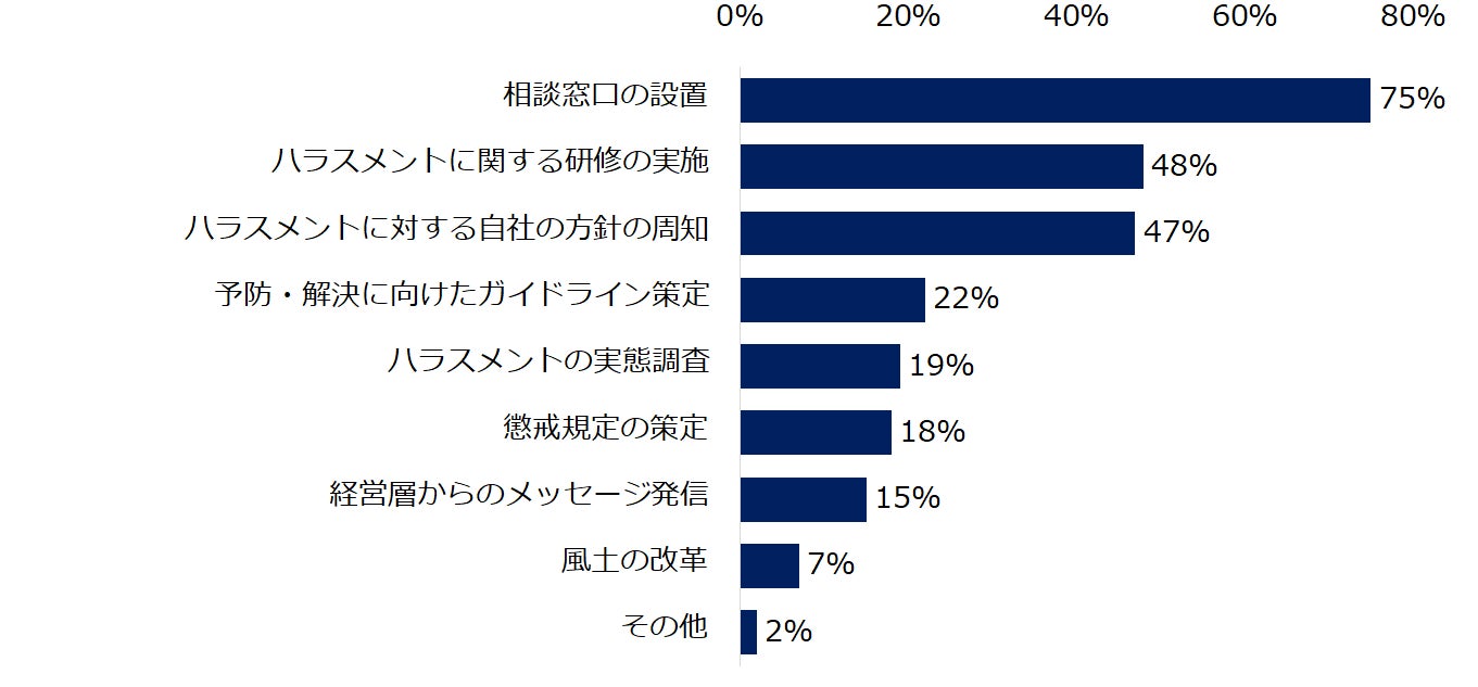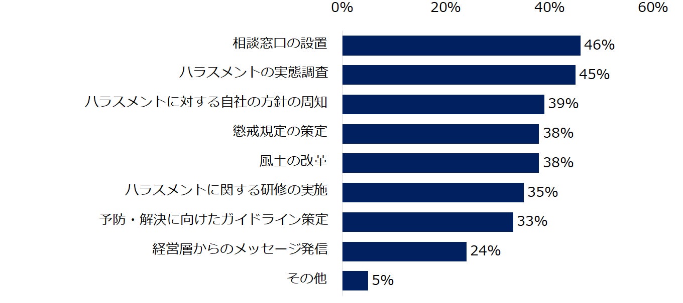 続いて「現在の職場ではハラスメント対策を実施していますか?」と伺ったところ、「実施している」が37%でした。これは、昨年(2023年)の同調査と比較して4ポイント低い結果です。「実施している」と回答した方に具体的な取り組みを伺うと、トップは「相談窓口の設置」(75%)でした。「ハラスメントのない職場にするために、企業にして欲しいことは何ですか?」と聞くと、トップ3は「相談窓口の設置」(46%)、「ハラスメントに関する研修の実施」(45%)、「ハラスメントに対する自社の方針の周知」(39%)でした。