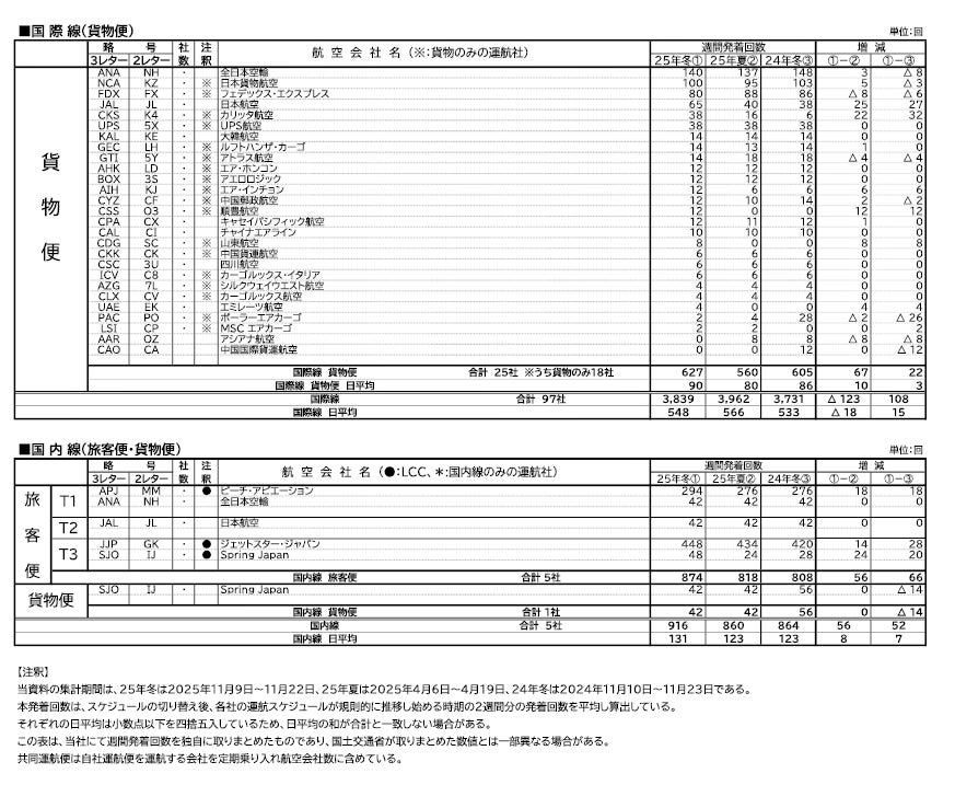 2025年冬期スケジュール(2025年10月26日~2026年3月28日)※1 の定期航空 会社別スケジュールは、発着回数が4,755回/週、就航都市数が海外104都市、国内18都市、合計122都市、定期乗り入れ航空会社数が97社※2 となりました。