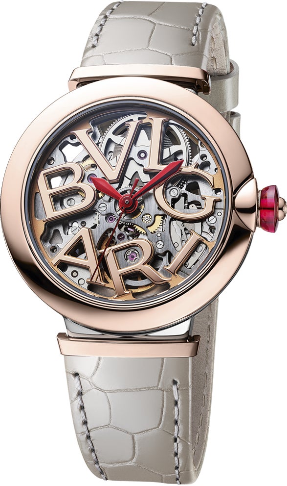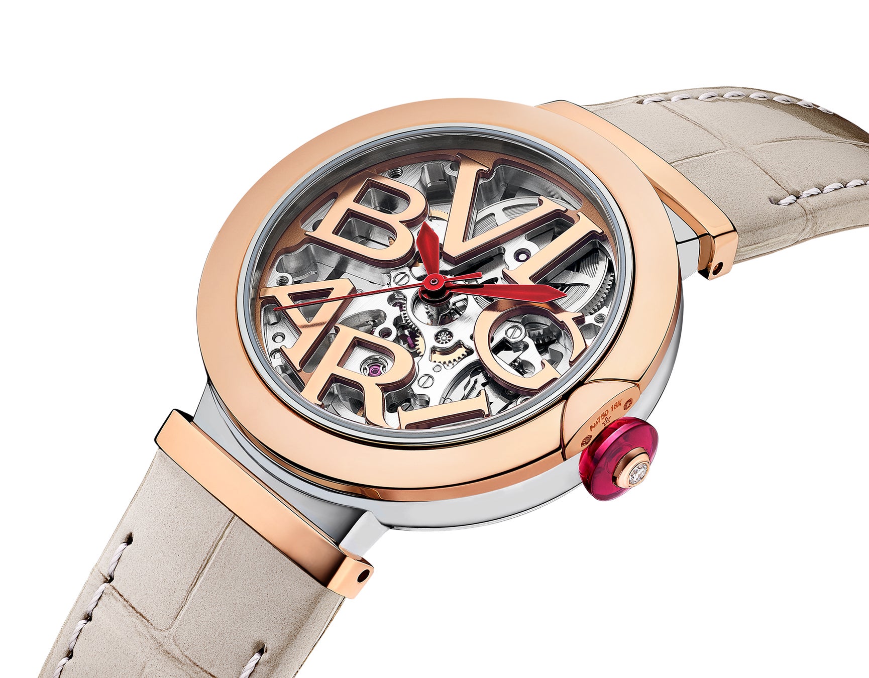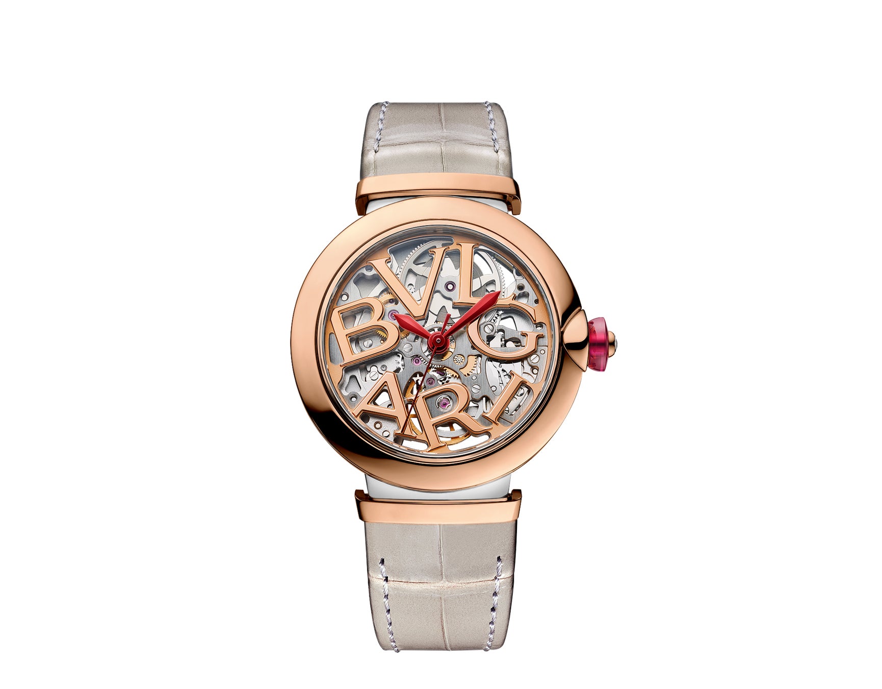 「ルチェア スケルトン」は、ブランドロゴをダイヤルデザインとしてムーブメントに取り入れた史上初のタイムピースです。新作「ルチェア スケルトン トルトラ 日本限定モデル」のオープンワークダイヤルに垣間見えるピンクゴールドのブルガリロゴにトルトラの美しい羽根を彷彿とさせるトープカラーのアリゲーターストラップのカラーコンビネーションは、手元に春の華やぎをもたらします。カボションカットのシンセティックピンクルベライトのリューズと同色の指針は、シンプルな中にも女性らしい優雅な印象をあたえます。