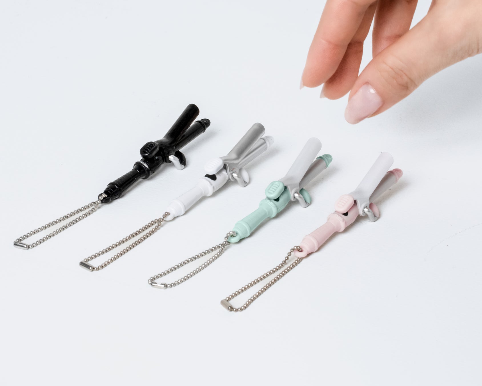 実物約1/4~1/5のサイズで、ヘアアイロンのプレートの開閉やドライヤーの折りたたみまでリアルに再現し、ミニチュアパッケージも付きます。定番カラーのブラック・ホワイトと、2026年春夏限定カラーであるミスティグリーン・ミスティピンクの計4色を展開。