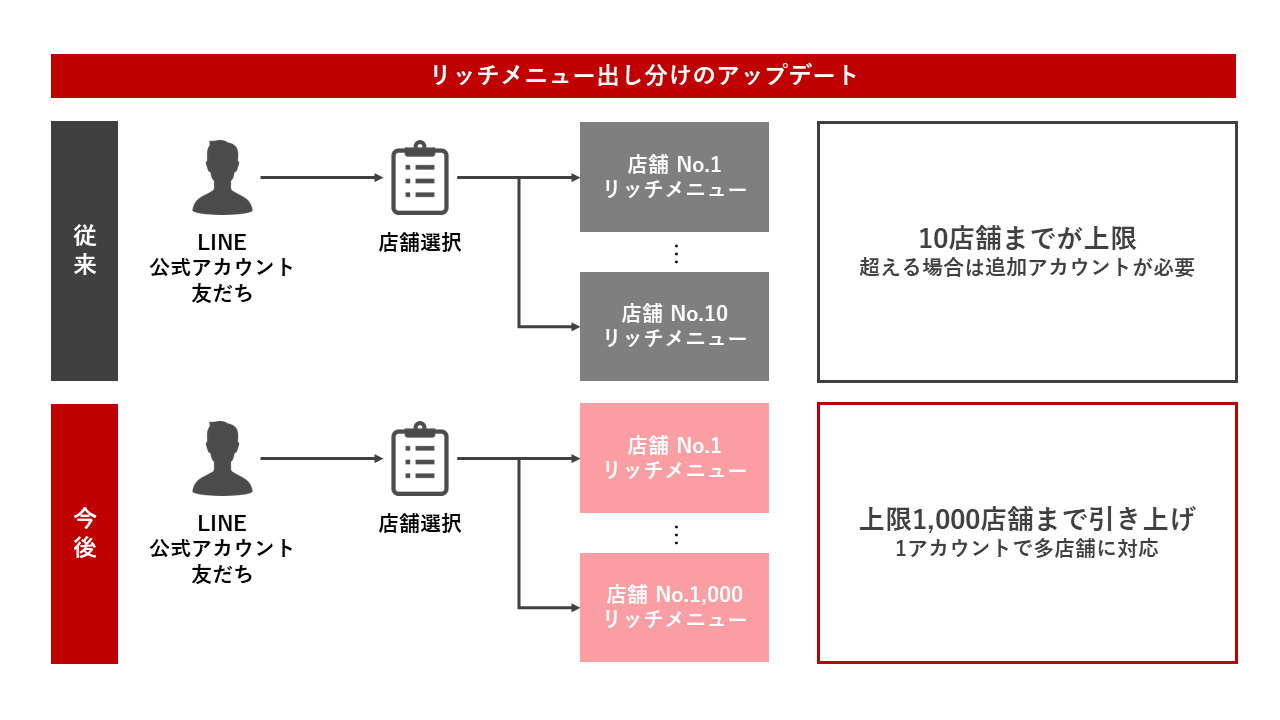 本機能により、友だち登録されたユーザーに対して、流入経路別に適したリッチメニューを最大1,000種類まで出し分けることが可能となります。また、主に飲食チェーン店など、多店舗事業を展開する企業においては、店舗ごとにリッチメニューの内容を切り替えることもできます。これにより、店舗ごとに運用していた「LINE公式アカウント」を、特定のアカウントに集約することもでき、メッセージ配信数の削減にもつながります。例えば、料金改定後、月に1万通の配信を行う場合、本機能を活用することで6割の費用削減効果が見込まれます。