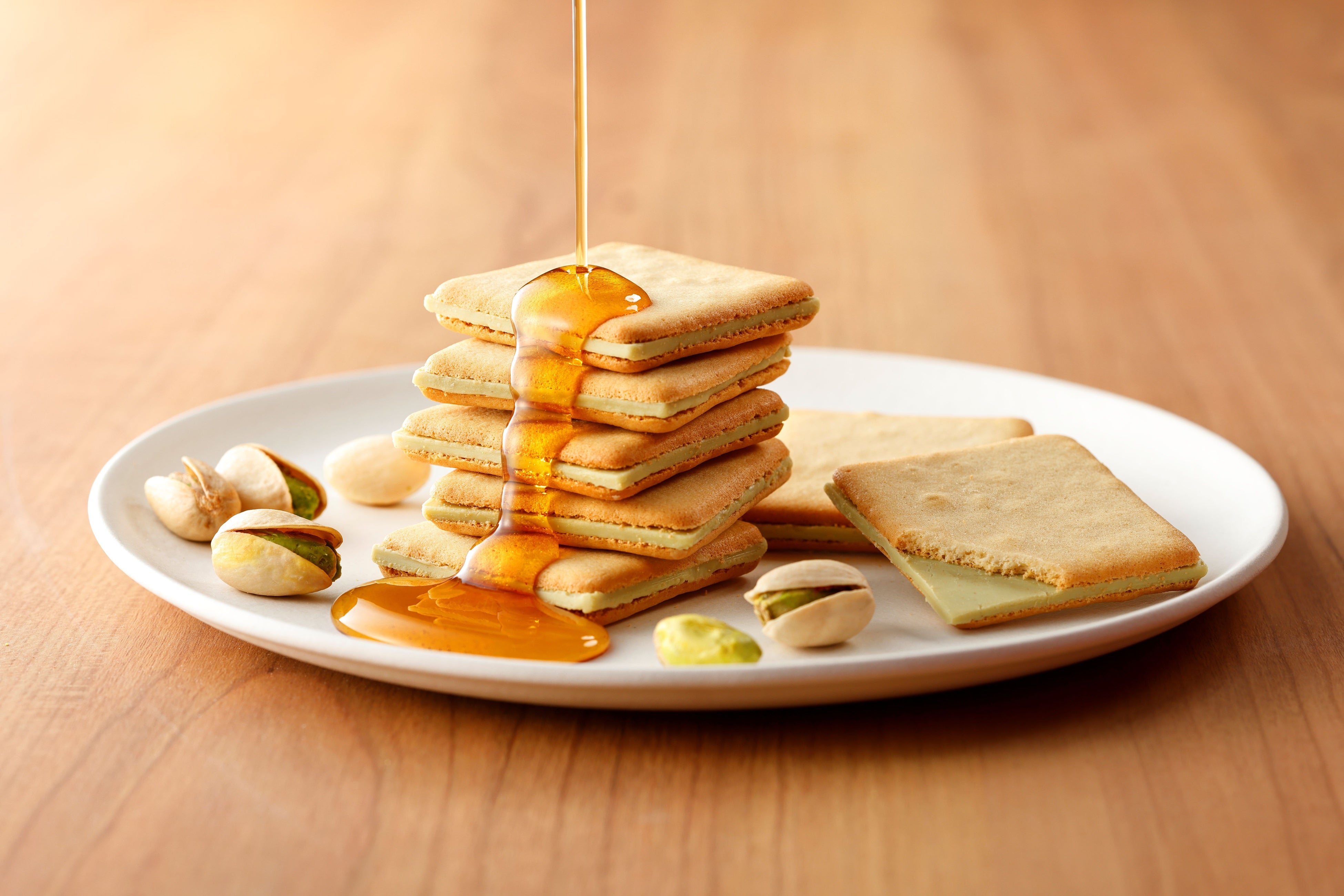 メープルシュガーを練りこんだ生地を、サクサクと軽い食感のクッキーに焼き上げ、香ばしいピスタチオチョコをサンドしました。