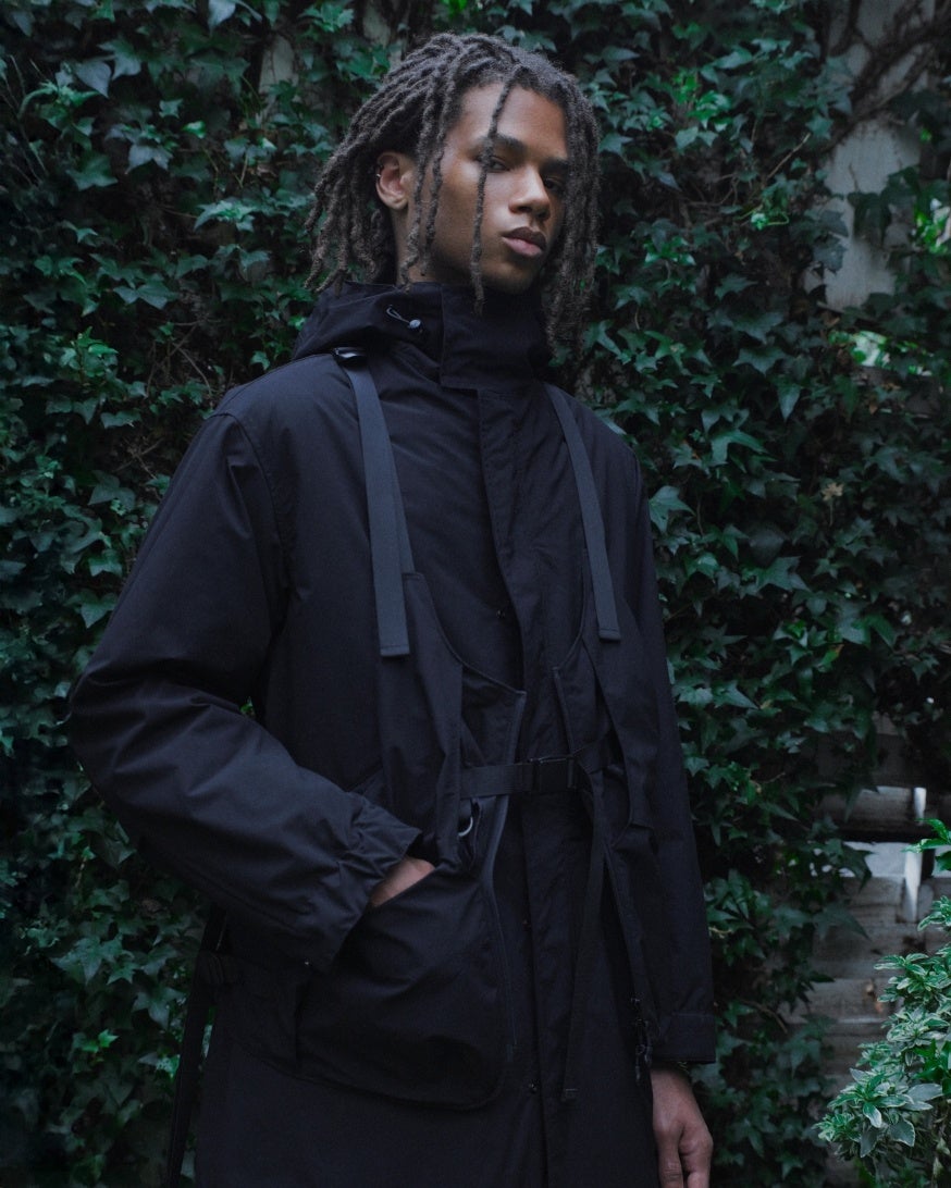 モッズコートをベースにしたフード付きコートで、ミリタリーの要素を現代的に再構築した一着。表地には撥水性のある素材を採用しており、雨天時にも安心して着用可能。内側にはキルティング仕様のダウンライナーを装備し、軽量ながら高い保温性を実現。ライナーは取り外し可能で、気温やスタイリングに応じて単体でも着用できる汎用性の高いデザインとなっている。