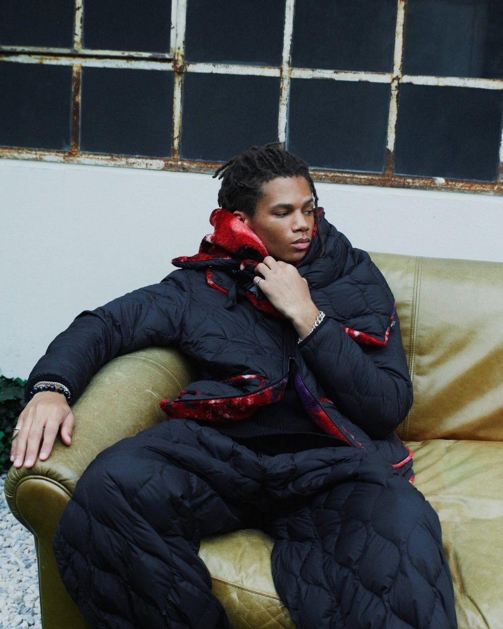 シルエット、素材ともに新たなアプローチで構築された一着。リバーシブル面では、裾やポケットからわずかに覗く赤がアクセントになっている。