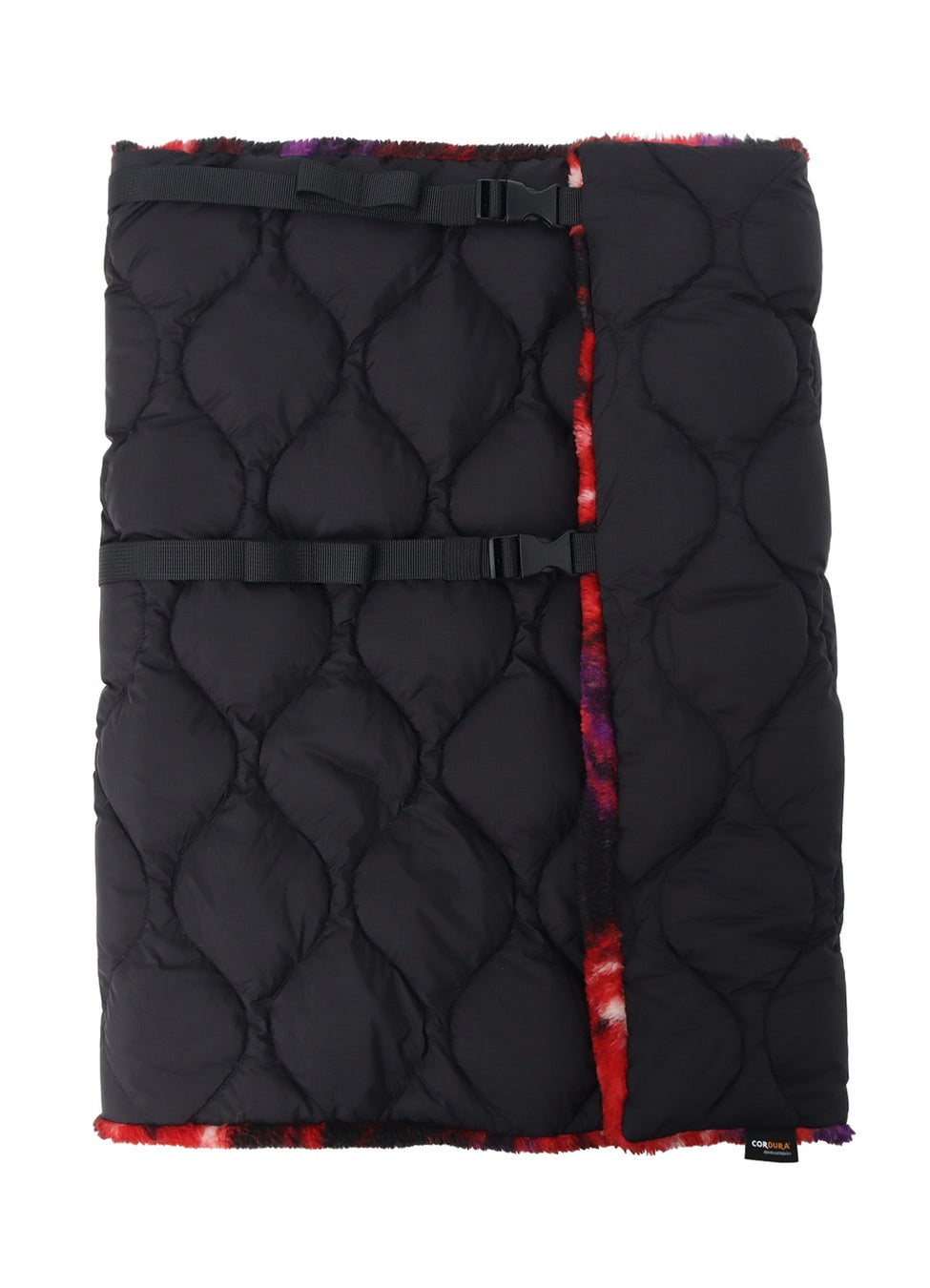 リバーシブル仕様で、スタイルに合わせて使い分けられる汎用性の高いアクセサリー。表面はキルティングダウンで高い保温性を確保し、裏面には赤いマーブル模様が施されたフリース素材を使用。