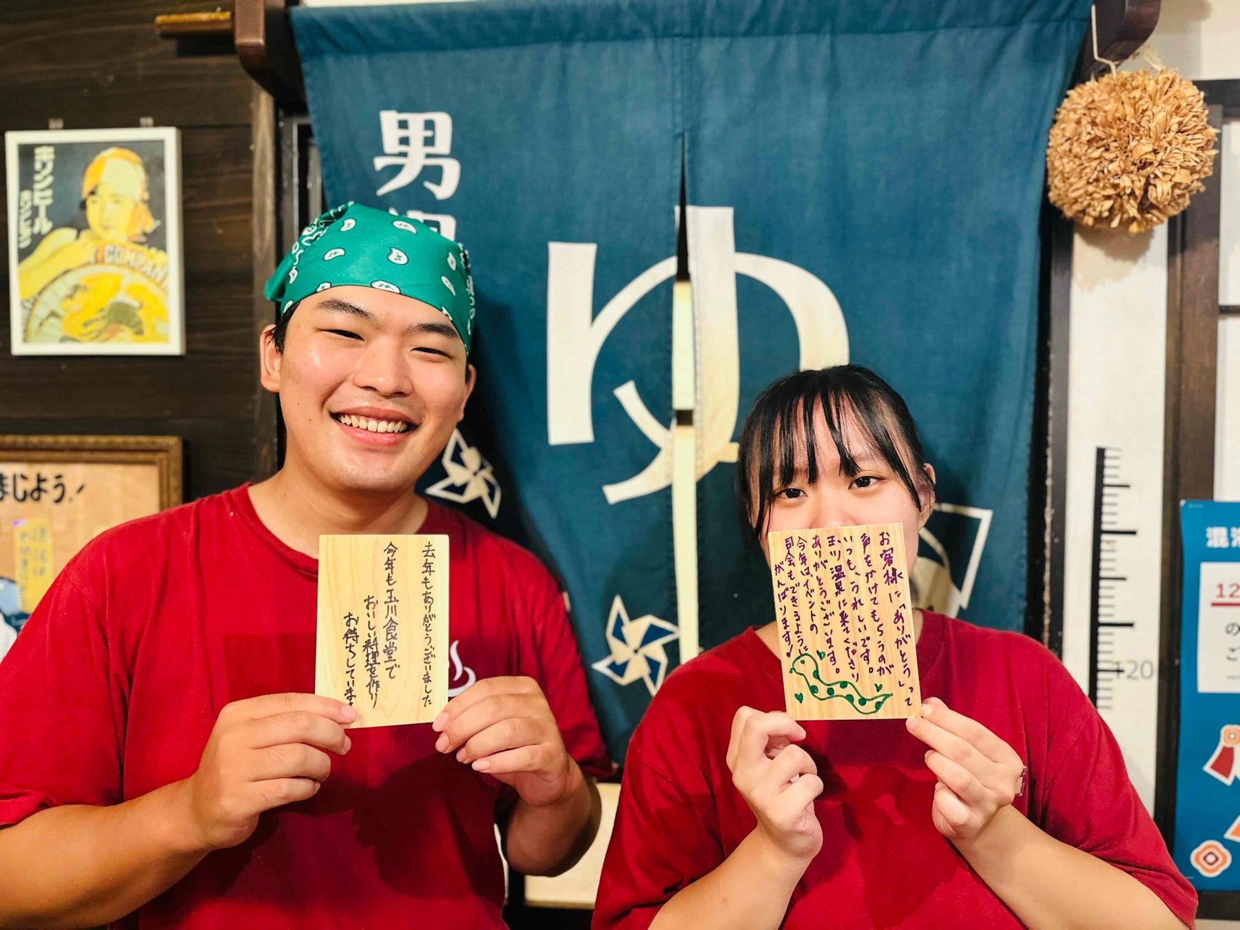 お風呂に浮かべる年賀状は、店舗で働く従業員がお客さまの顔を浮かべながら、感謝の気持ちと新年の挨拶を書いています。たくさんのお客さまが来る年末年始前に、従業員が「お客さまの事を考える」「自分たちの想いを考える」機会としてもご活用いただけます。
