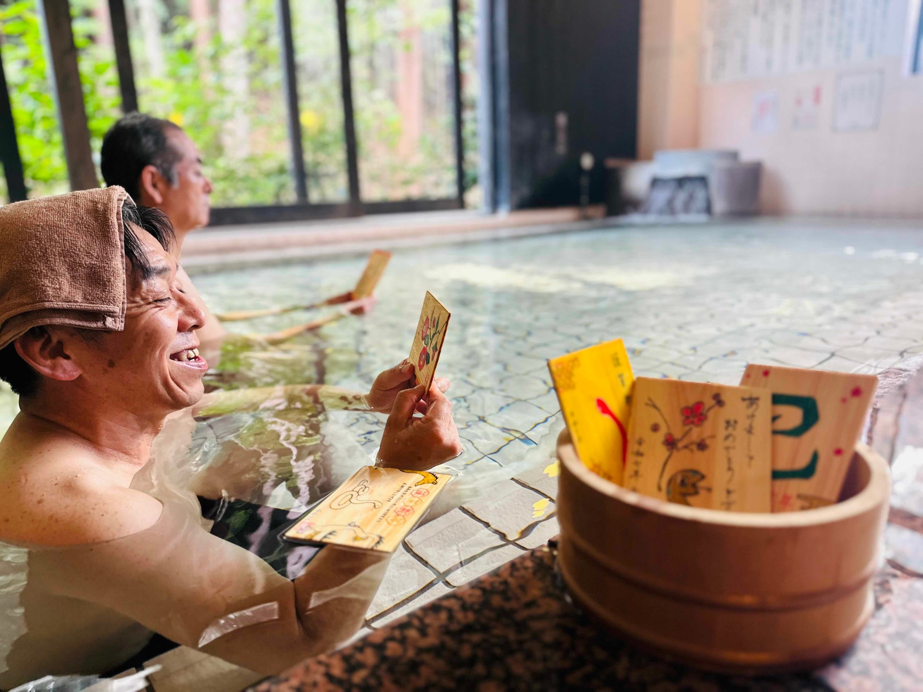 年賀状風呂は、店舗で働く従業員がお客さまへの新年のご挨拶の気持ちを込めて書いたヒノキの入浴木を男女それぞれの浴室に浮かべるというものです。入浴木は埼玉県の「木の町」ときがわ町のヒノキ間伐材を年賀状サイズにカットしています。新年ならではの「ほっこり」するイベントとして、毎年お客さまに楽しんでいただいています。