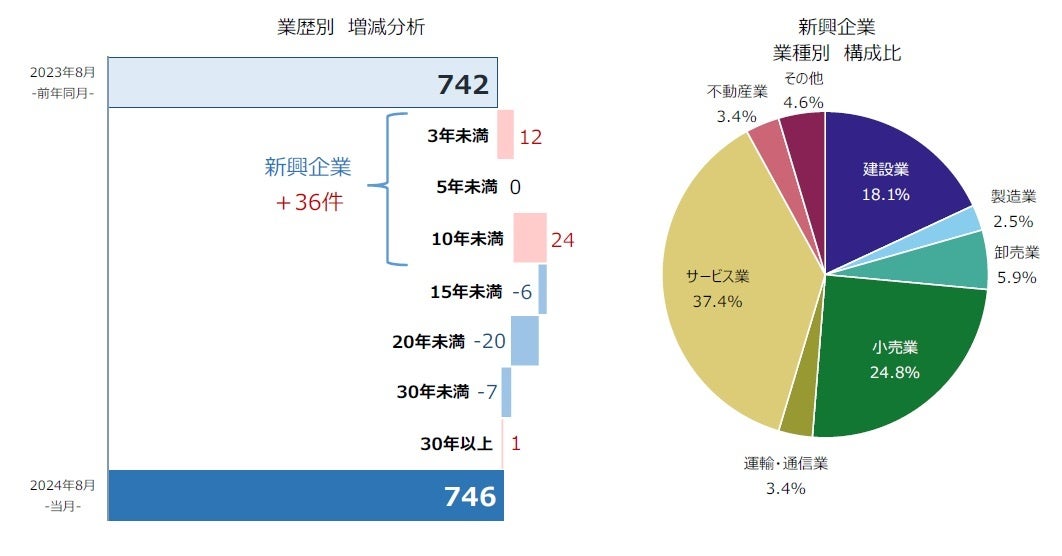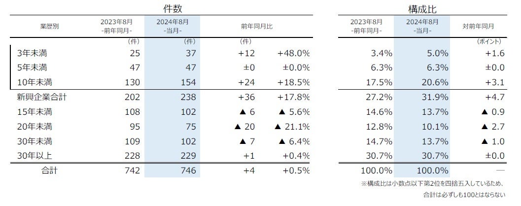 業歴10年未満の『新興企業』(「3年未満」〈前年同月25件→37件、48.0%増〉、「5年未満」〈同47件→47件〉、「10年未満」〈同130件→154件、18.5%増〉)は238件(前年同月202件、17.8%増)だった。30カ月連続で前年同月を上回り、2000年以降で最長の増加期間となった。内訳を業種別にみると、「サービス業」(同70件→89件、27.1%増)が最多、「小売業」(同43件→59件、37.2%増)、「建設業」(同34件→43件、26.5%増)が続いた。