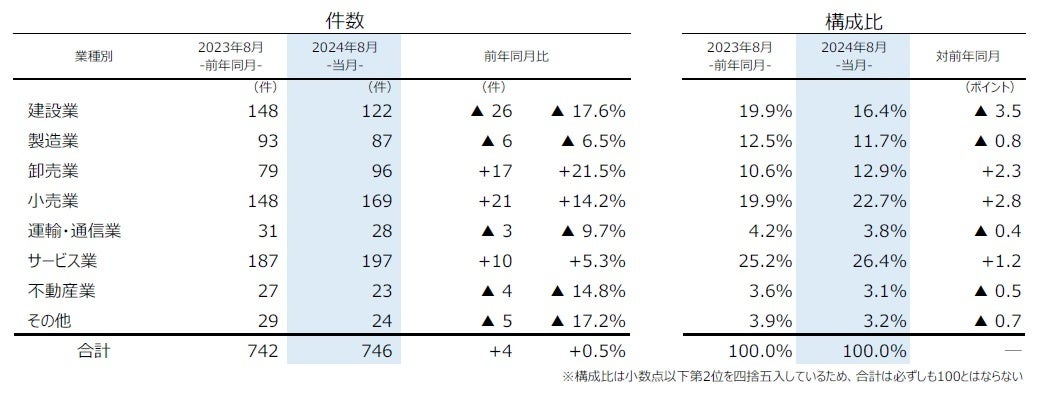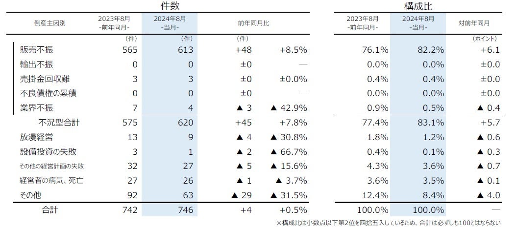 倒産件数は746件(前年同月742件、0.5%増)と、28カ月連続で前年同月を上回った。8月としては、前年(742件)を超え、過去10年で最多となった