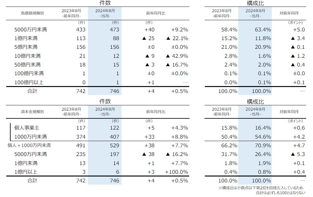 資本金規模別にみると、『個人+1000万円未満』の倒産が529件(前年同月491件、7.7%増)となり、全体の70.9%を占めた。