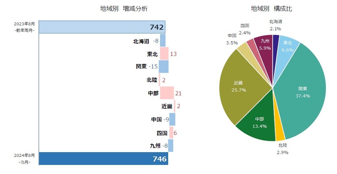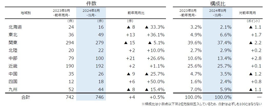 地域別にみると、9地域中5地域で前年同月を上回った。最も件数が多かった『関東』(前年同月294件→279件、5.1%減)は19カ月ぶりに前年同月を下回った。最も増加率が高かったのは『四国』(前年同月12件→18件、50.0%増)で、5カ月ぶりに50%以上の増加率となった。2024年1-8月の累計では、すでに5県が2023年通年の件数を上回った