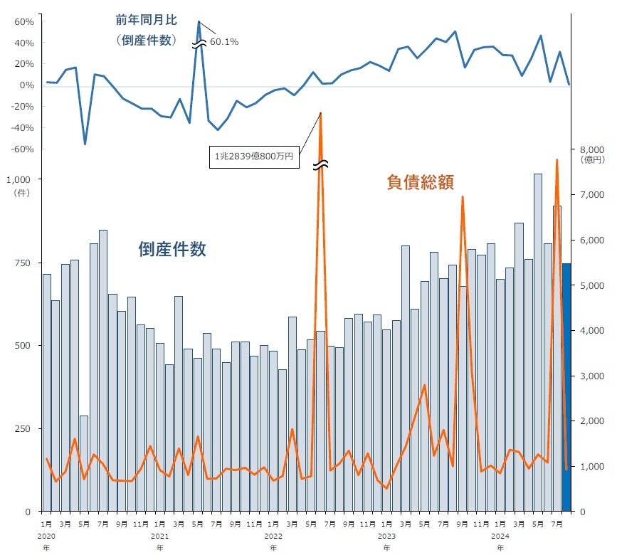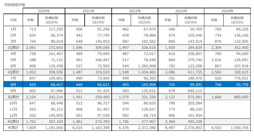 倒産件数は746件、28カ月連続で前年同月を上回る 8月としては過去10年で最多 ― 全国企業倒産集計2024年8月報